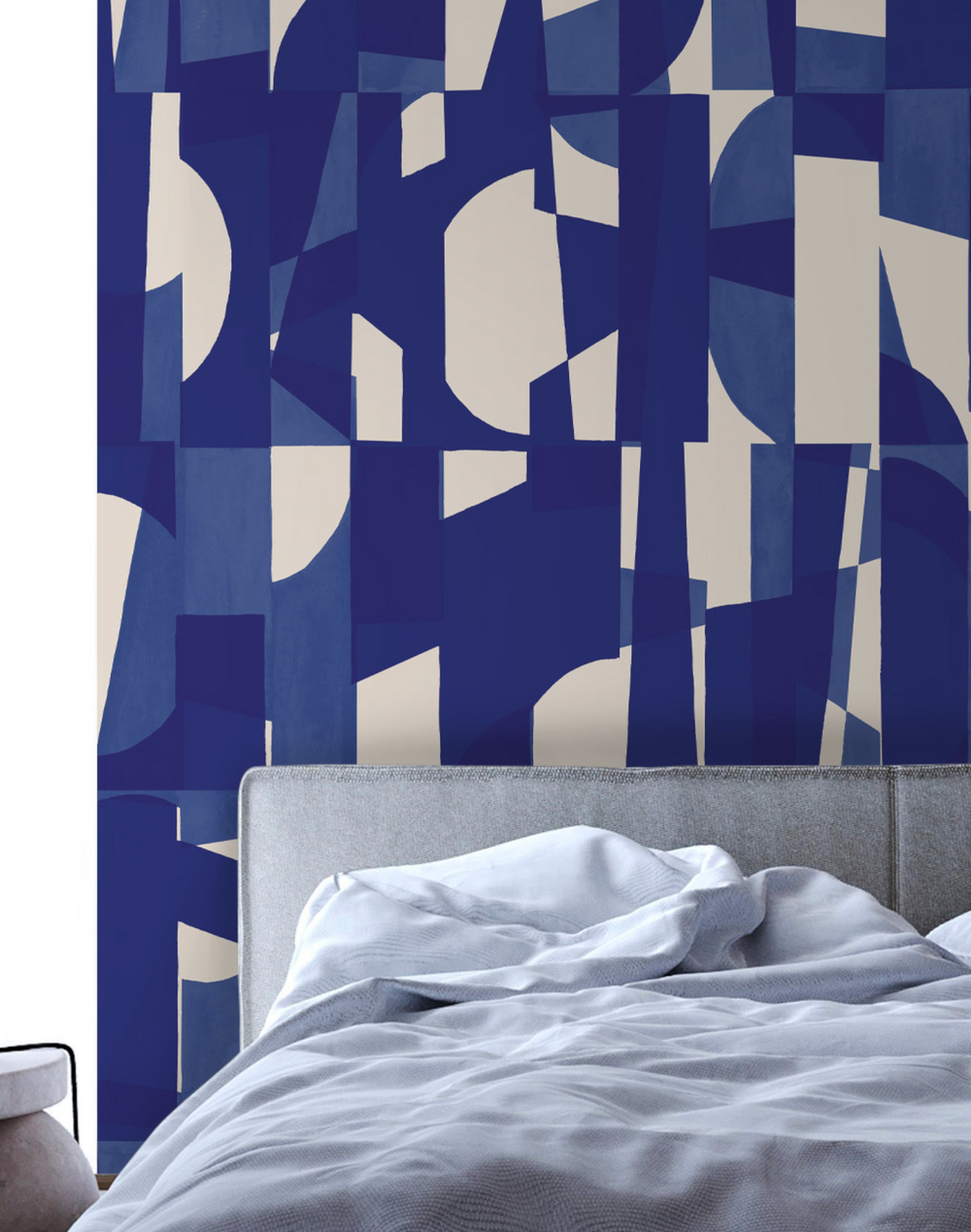 "Lunar Aesthete" is inspired by the waxing and waning of the lunar cycle. Featuring abstract brushstrokes in monochrome midnight blues on a starry beige background, it invites the romance of the moon into any space.