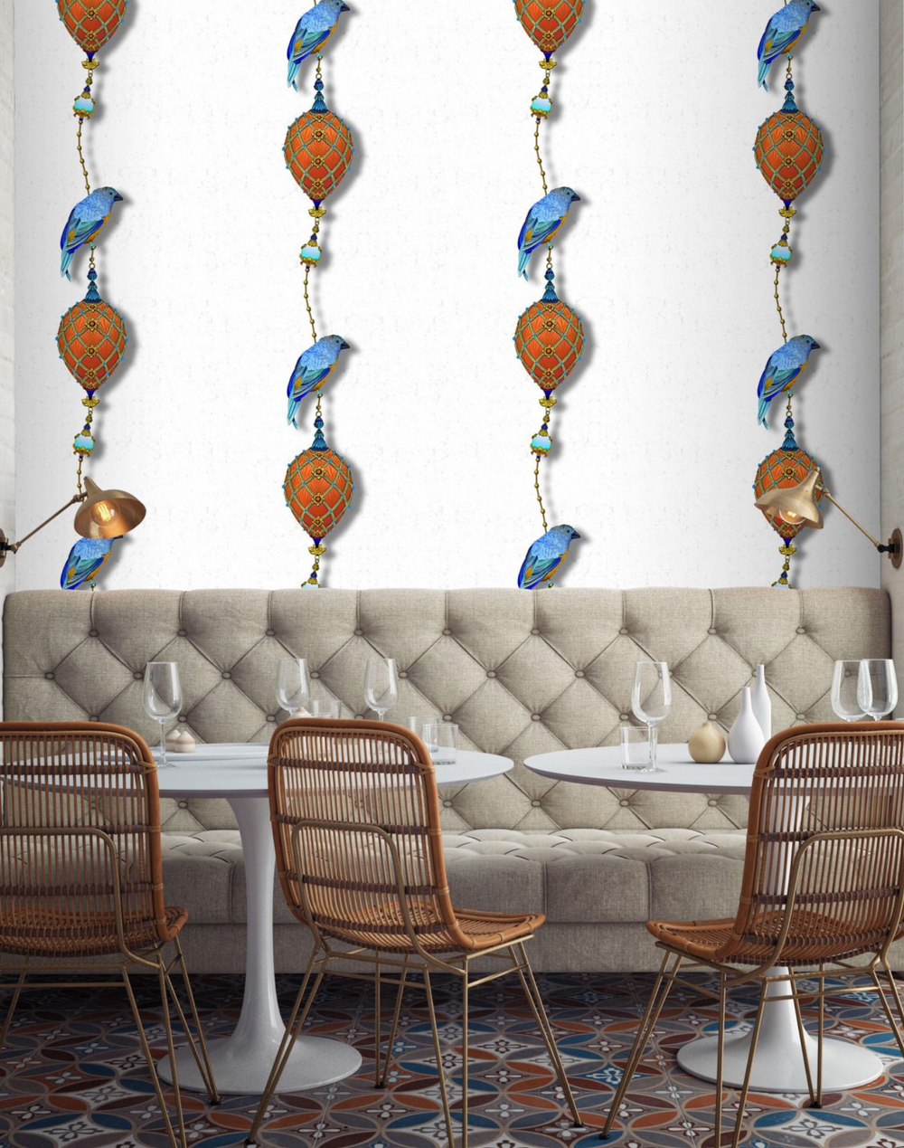 Pendants & Ornamental Birds is a whimsical reimagining of a classic stripe. Timelessly elegant strings of pearls form the basic vertical thread of the stripe motif, which is punctuated with a repeat of richly ornate jewels and exotic birds. Hand-drawn with our characteristic attention to detail, these highly rendered embellishments elevate the humble stripe to decadence. Generous spacing between the drawn elements allows the detail to shine, whilst the negative space imbues this wallcovering with a deep sense of order and calm.