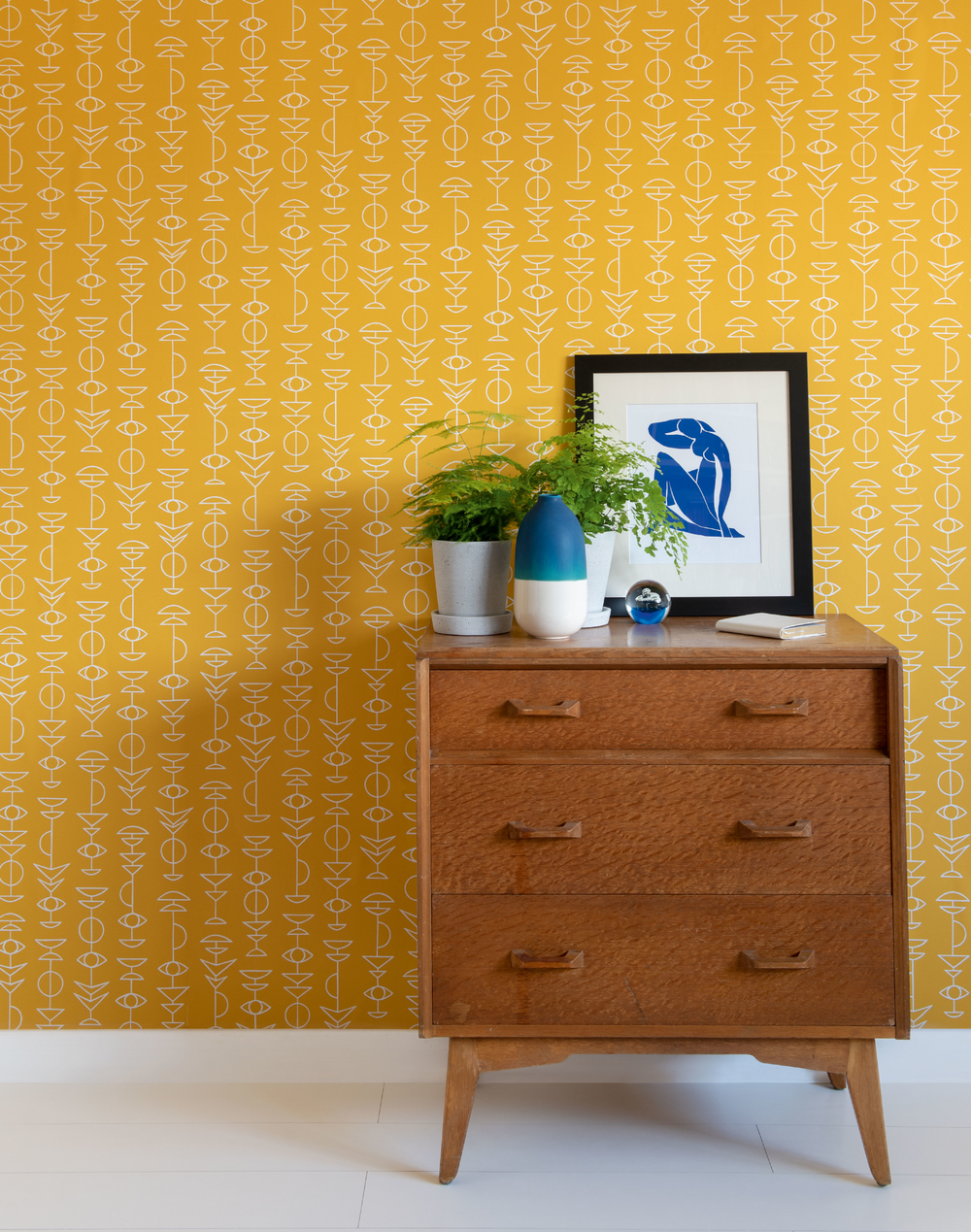 Inspired by geometry, elementary shapes and ancient symbols, the design creates vertical repeating hieroglyphs. The bold graphic pattern is highlighted by metallic inks and the tactile finish of a rich surface print technique. All MissPrint patterns were originally drawn by hand and developed in their own studio.