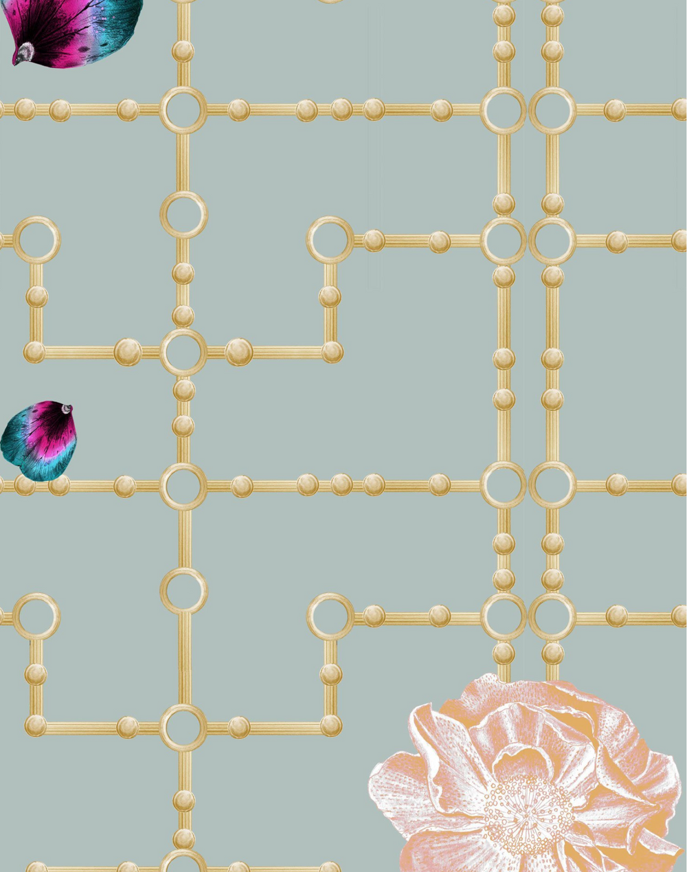Quinn Orchid is a surreal scene that draws together opulent design and delicate nature. A fretwork of brilliant gold structures a geometric architecture. Fine pansy petals float down in front and behind the frame, giving the subtlest hint of dimension to the space. Ornate, monochromatic camelias embellish the fretwork, their seemingly carved nature marrying the beauty of the natural world with the artisanship of the decorative arts. Whilst sumptuous in subject matter, the sparing use of each element imbues the design with an elegant restraint.
