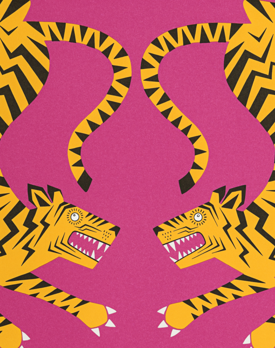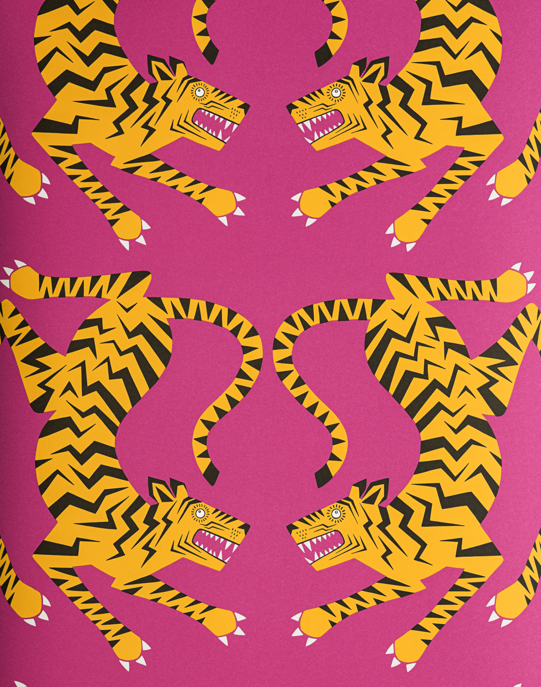 Graphic, stylized tigers dance together in this fun, vibrant wallpaper. A bold mirrored pattern, it is ideal for those wanting to make a statement and is available in five striking colorways with names as memorable as their designs ? Tony, Trixie, Tabby, Tinker and Tigger.