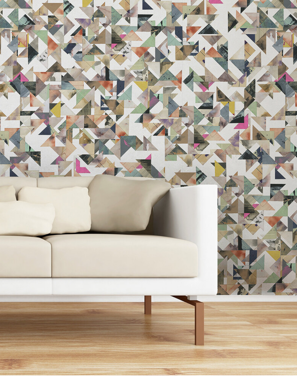 Trade Routes is a guest appearance by Max Kahan, artist, wallpaper hanger and Merenda’s life partner. Kahan worked with treated paper in a consistent triangle shape to create a free-flowing map that reflects the need to both back off and bear down when finding the path of balance in life. The interplay of precision, randomness, structure and fluidity is expressed in this colorful and mesmerizing wallpaper designed from original artwork by Kahan.