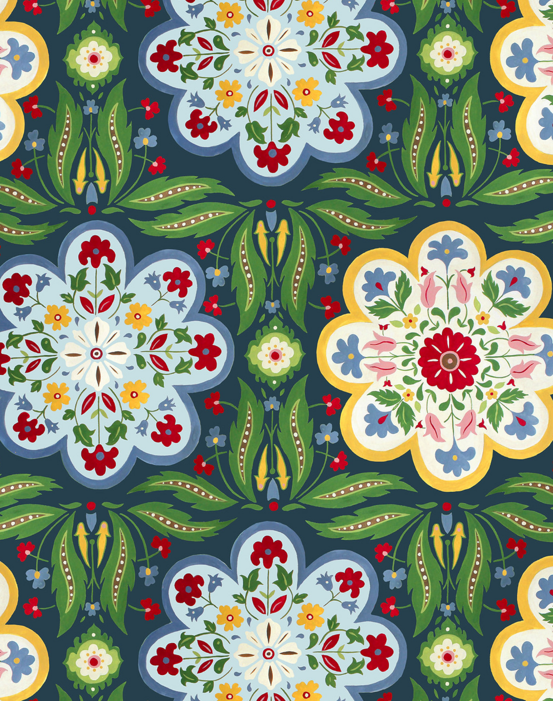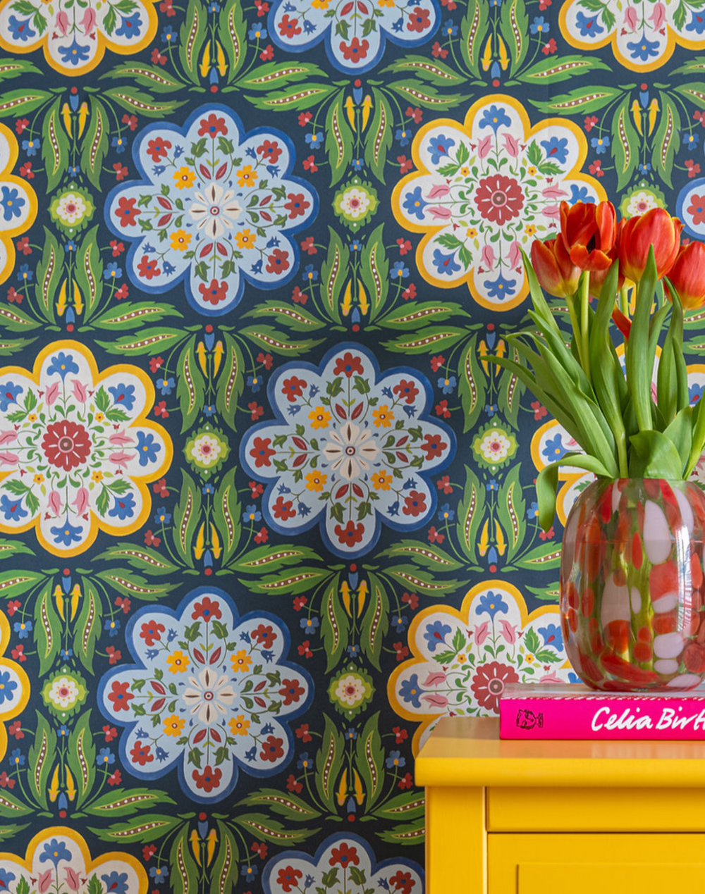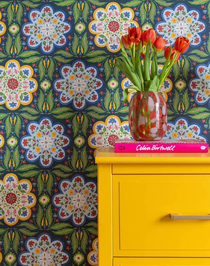 Our Zouak Wallpaper in Midnight is a gorgeous geometric style print inspired by the beautiful painted ceilings of the Bahia Palace in Morocco. Our print pays homage to the craftmanship and skill of zouak, the name given to the traditional art of decorative wood painting. The compositions would emphasize symmetry and repetition giving a sense of depth and grandeur. Colored on a deep inky backdrop that captures the mystique of the night sky and enriched with exotic primary tones reminiscent of the city's culture and artistry.