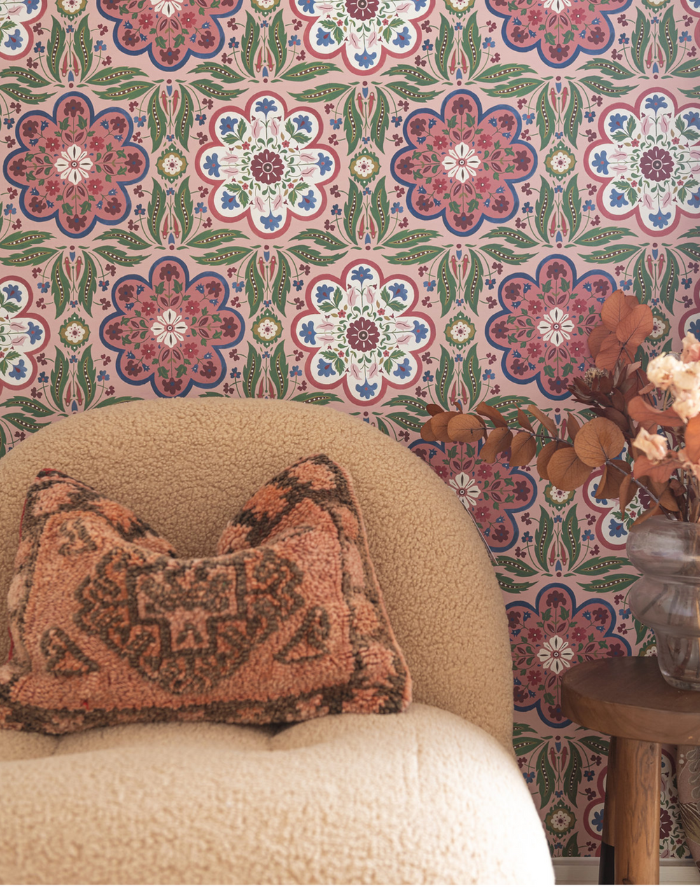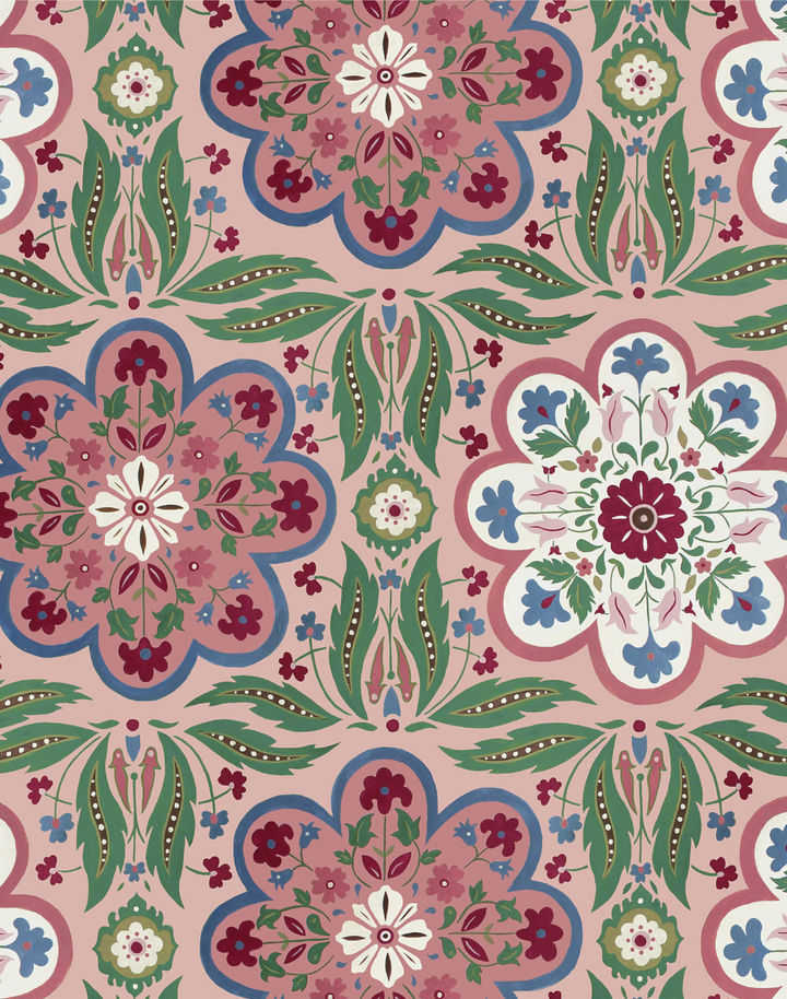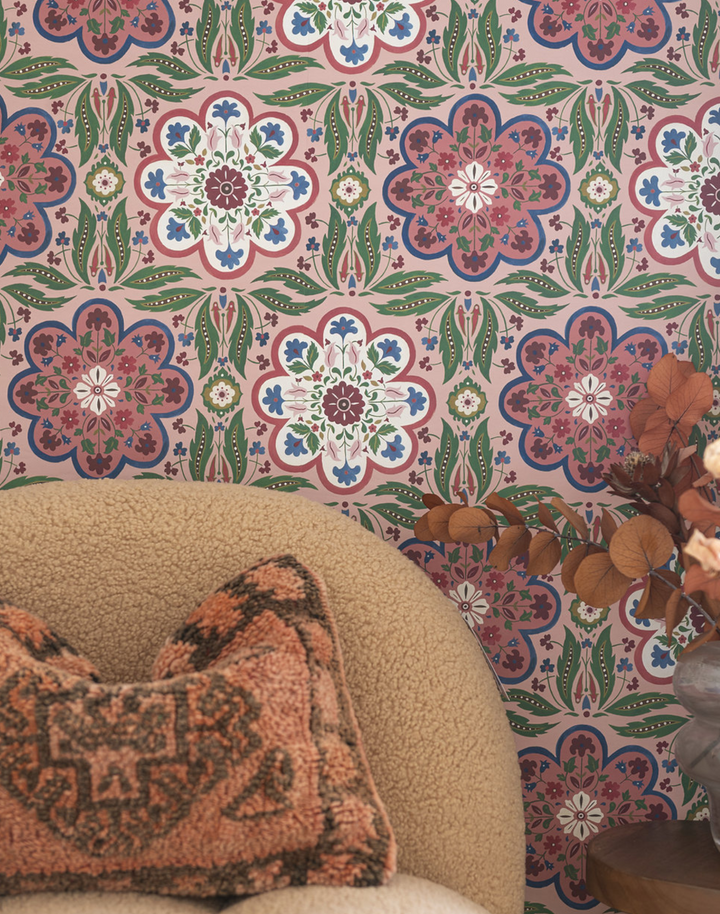 Our Zouak Wallpaper in Old Rose is a gorgeous geometric style print inspired by the beautiful painted ceilings of the Bahia Palace in Morocco. Our print pays homage to the craftmanship and skill of zouak, the name given to the traditional art of decorative wood painting. The compositions would emphasize symmetry and repetition giving a sense of depth and grandeur. Colored in warm dusty pinks reminiscent of the city's sun drenched walls. This shade feels both grounded and and luxurious with a timeless appeal tied to Morocco's artistic heritage.