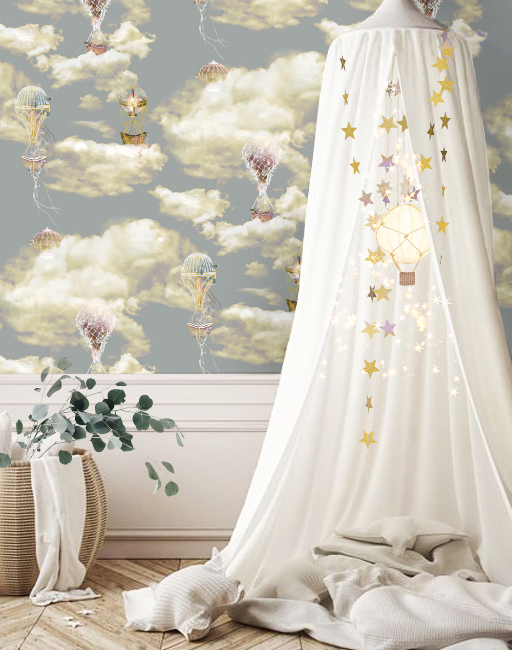 Good & Craft creates innovative, and whimsical patterns that are rich in details and sensual colors. Whimsical hot air balloons float through the sky amongst shimmering clouds. Printed on a pearlescent paper for luxurious shine with a mother-of-pearl effect.