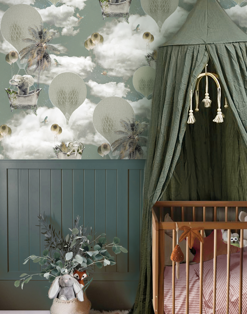 Good & Craft creates innovative, and whimsical patterns that are rich in details and sensual colors. Whimsical hot air balloons float through the sky amongst shimmering clouds. Printed on a pearlescent paper for luxurious shine with a mother-of-pearl effect.