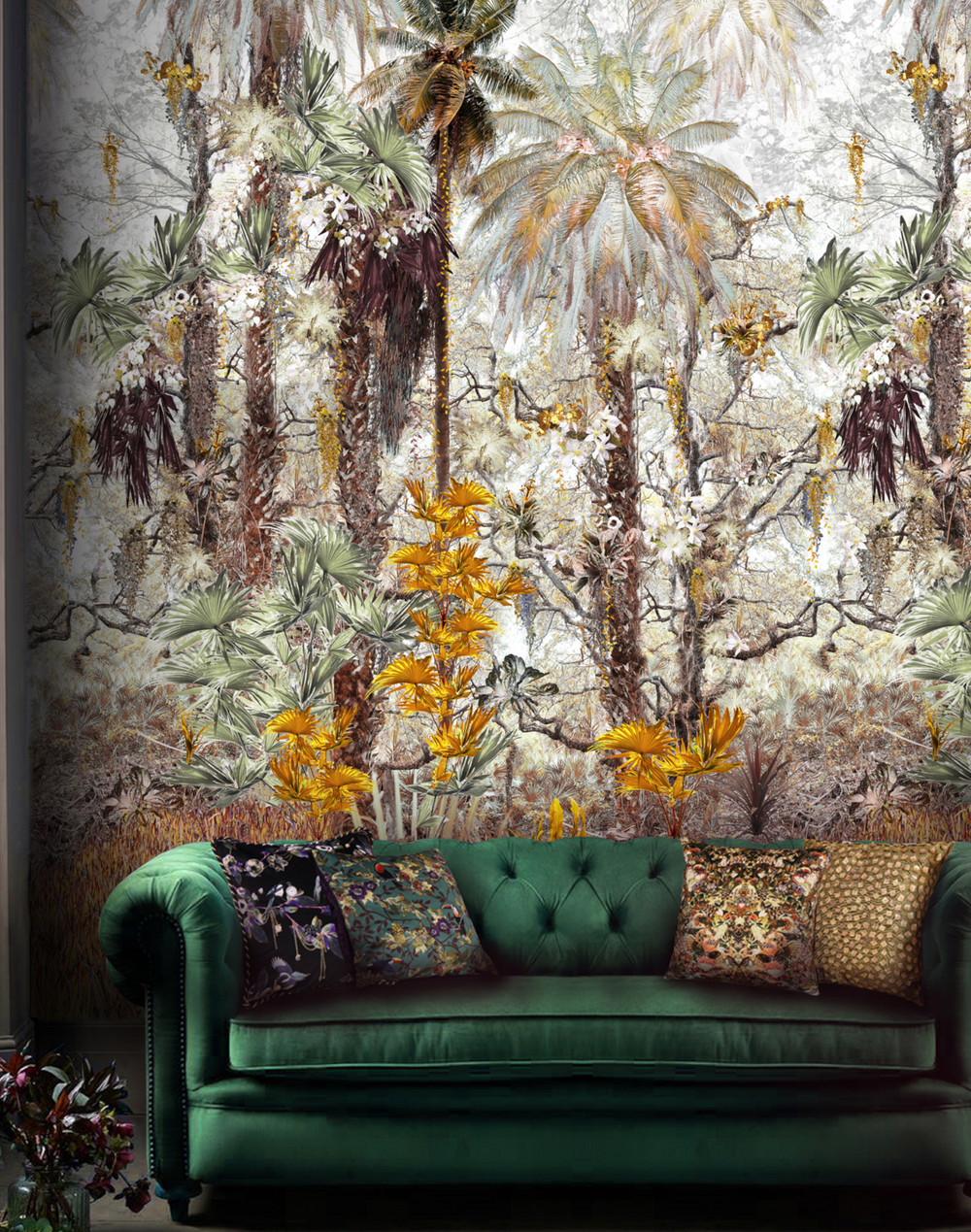 The Jungle Mural pattern is part of the Tropical State of Mind collection, inspired by the vibrant flora and fauna of tropical climates. Rich colors are key and bringing a tropical feeling in every home