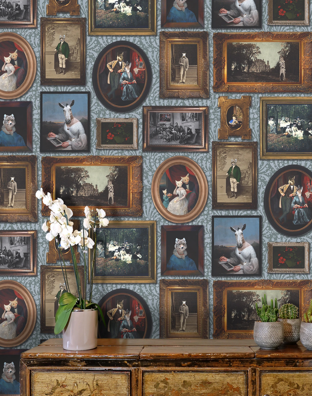 "The art gallery wallpaper contains a background created from an original 19th century, intricately carved wooden wallpaper block that Charlotte has had hanging above her printing press. The collection of paintings featured in the wallpaper are original works of art by Charlotte. Several of these work have been shown at the Royal Academy Summer exhibition, with the the Lady Wolf portrait ̴ being exhibited at the 2019 Summer Exhibition. A wonderful way of having a handsomely framed paintings on your wall."