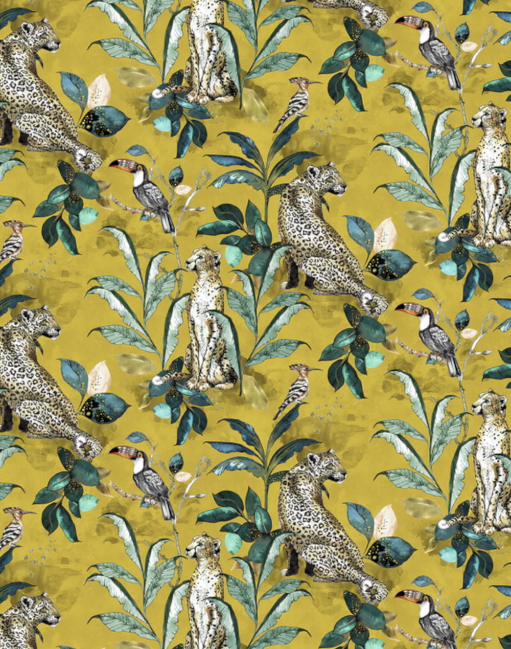 Savannah is the beautiful new wallpaper collection from Laura Hyden. Featuring an intricate hand painted cheetah and leopard set amongst a bold jungle backdrop on mustard.