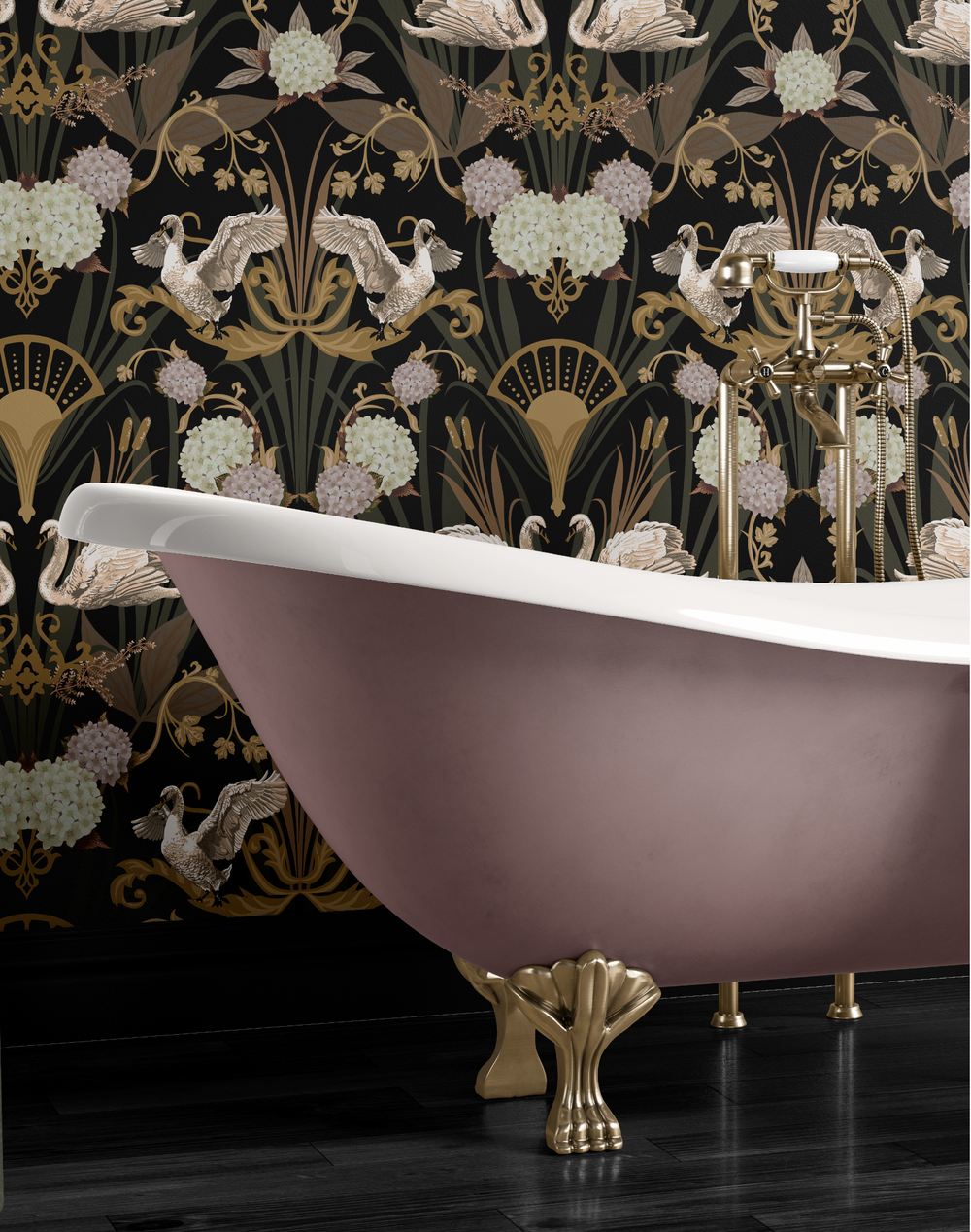 Deco Swan by Becca Who is a stunning design bursting with luxury and elegance. Graceful swans framed by floral hydrangeas and ornamental motifs are brought to life by the subtle shimmering pearlescent finish of the paper. The dark charcoal colorway with its muted earthy tones, is sure to create a bold impact in any interior space.