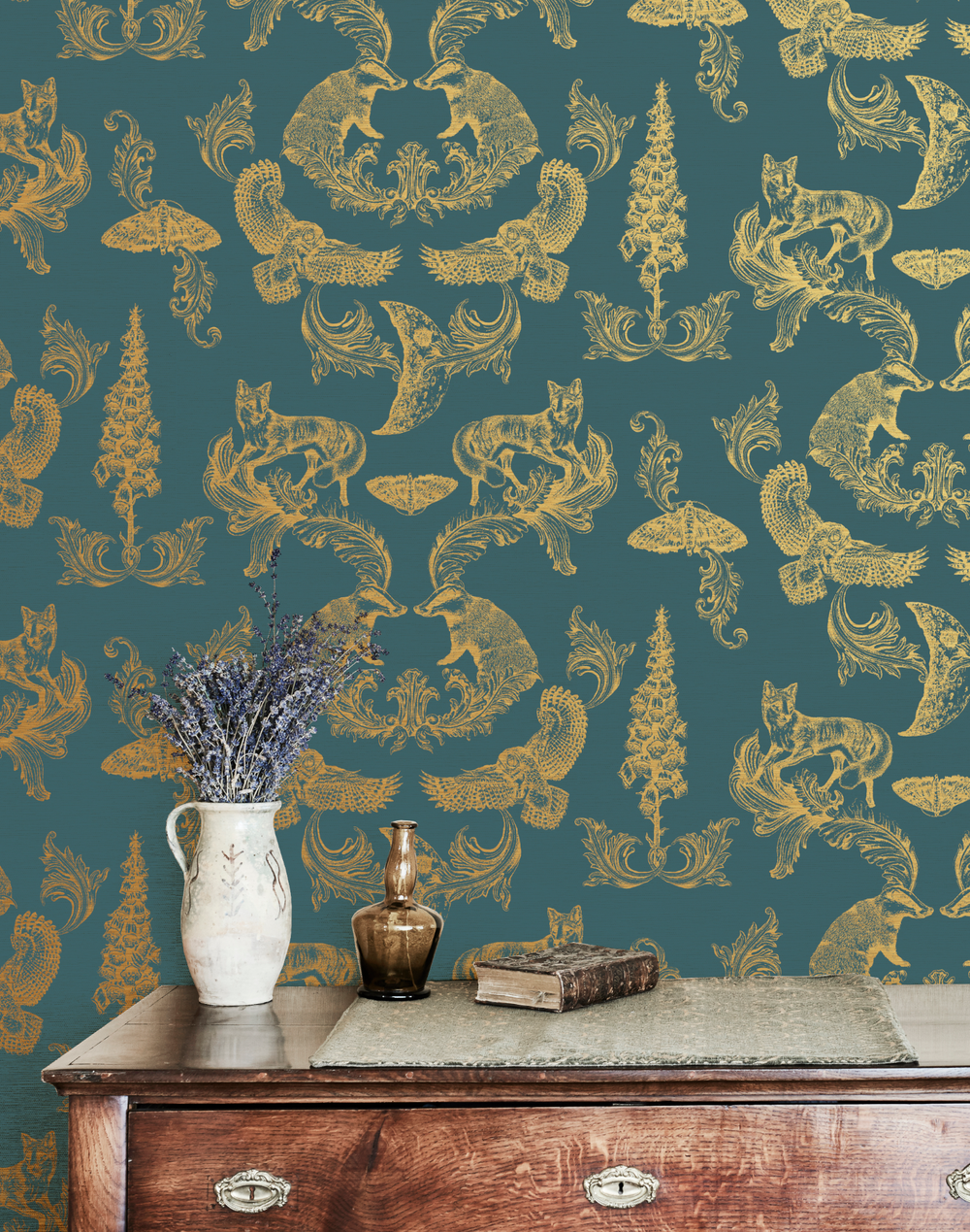 "A beautiful wallpaper design by Laura Garner featuring charming hand drawn illustrations of whimsical woodland creatures including badgers, foxes and birds, all of which can be found nestled amidst forest foliage beneath a shimmering golden moon. Set upon a rich teal background, this stylish and sophisticated wallpaper is a modern and contemporary twist on the traditional damask style which will look stunning in a rural retreat or city living space."