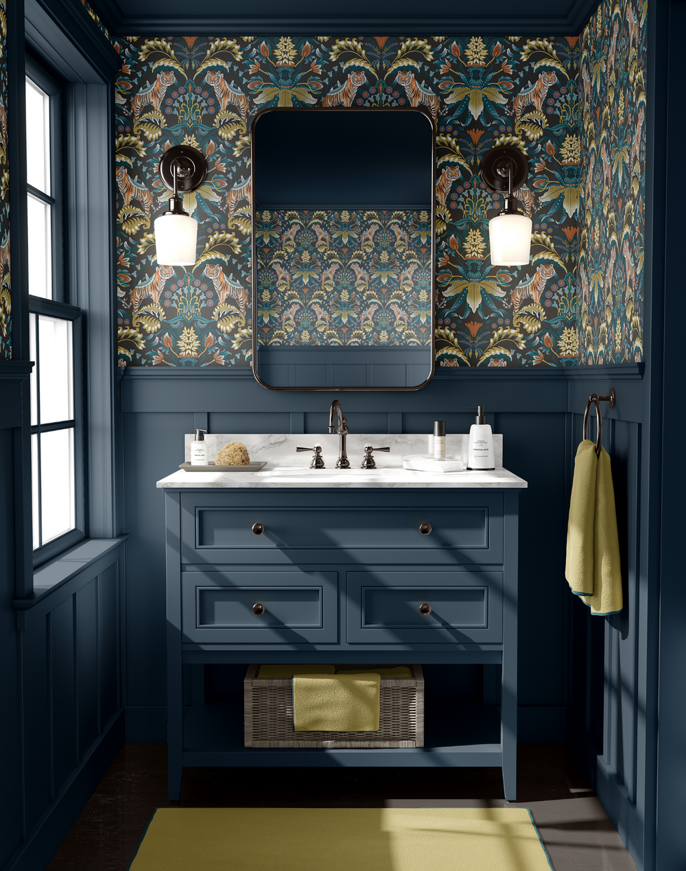 A striking design from Richard Hayley with hand drawn majestic tigers prowling through a stylized jungle of traditional exotic floral motifs and ornament. A rich palette of golden mustard and burnt orange pop against a deep charcoal background and add a warmth evocative of tropical climes. This bold wallpaper is sure to make a statement in any interior.