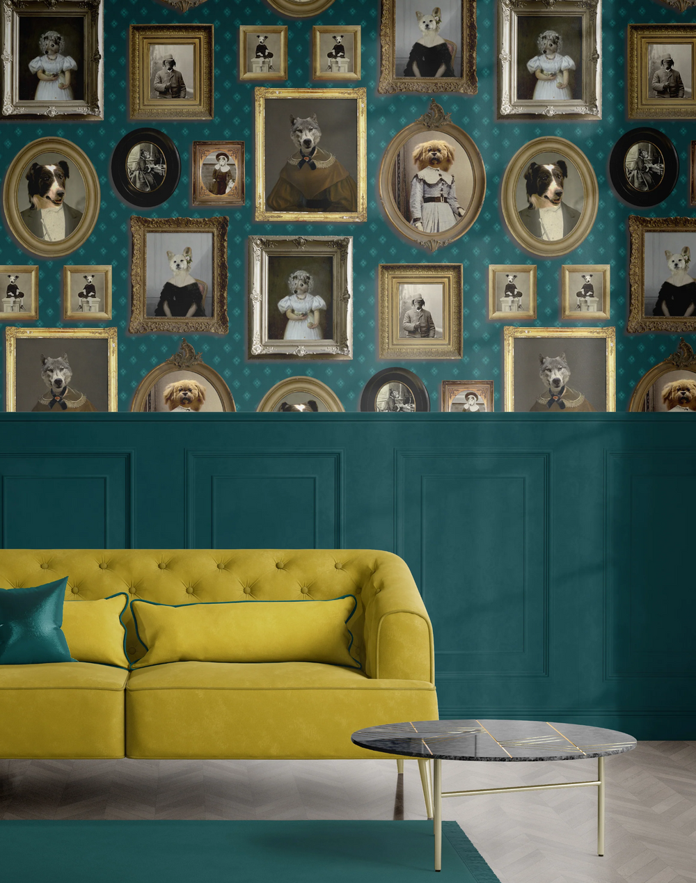 The designer, Charlotte Cory, admits she could never live without a dog, or two, or three. Life is simply not long enough to enjoy these wonderful creatures (Charlotte is never less than over-enthusiastic!). So what can be better than a wall full of them! And not just any dog - top dogs! Canines who have had their likeness captured by top portrait artists (like Charlotte Cory herself!). Cave canem! said the Romans. Beware of the dog. Beware of all these gorgeous creatures - you will fall in love and never be able to live without them.