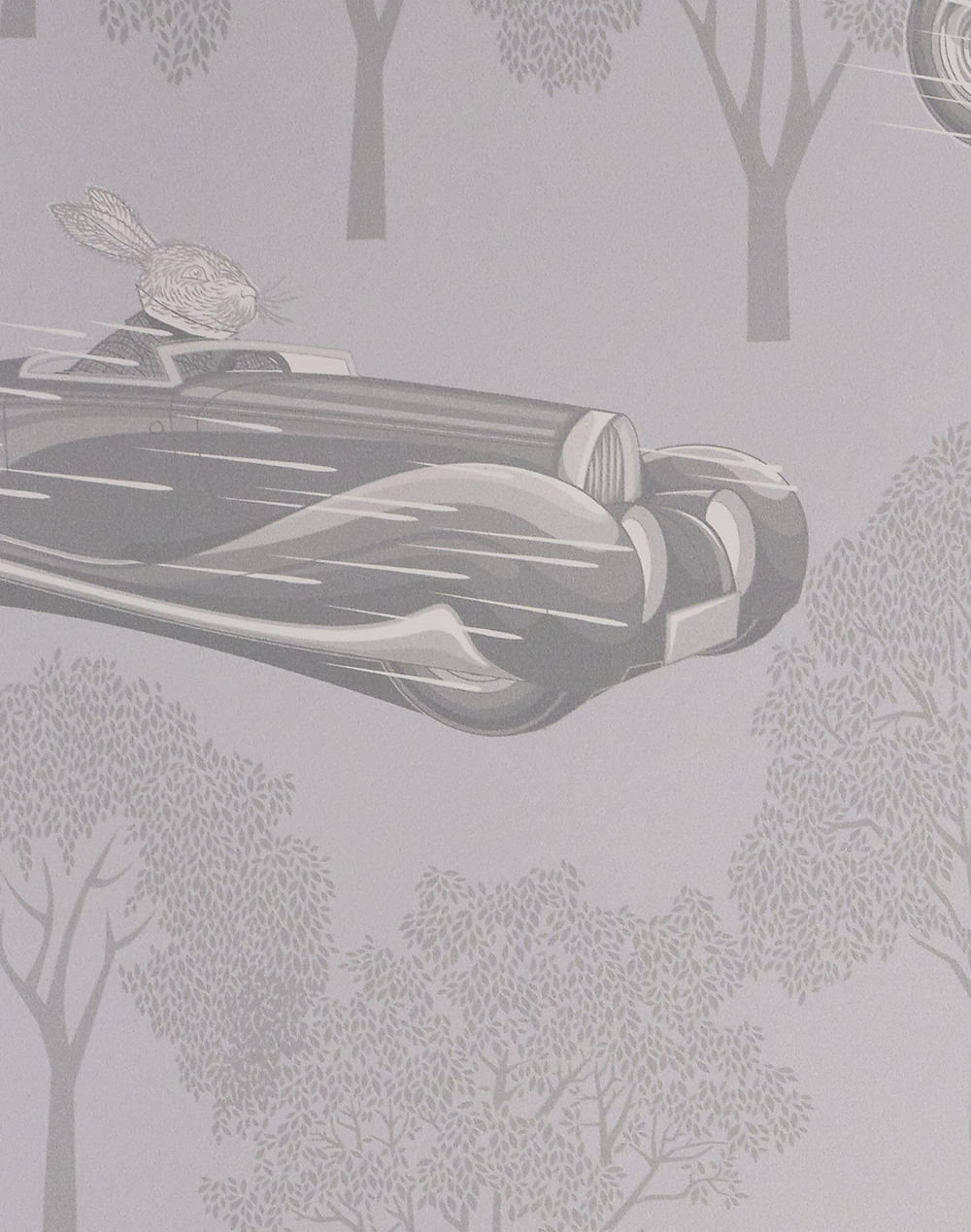 Cute bunnies with the need for speed racing across the walls in Midnight Blue.