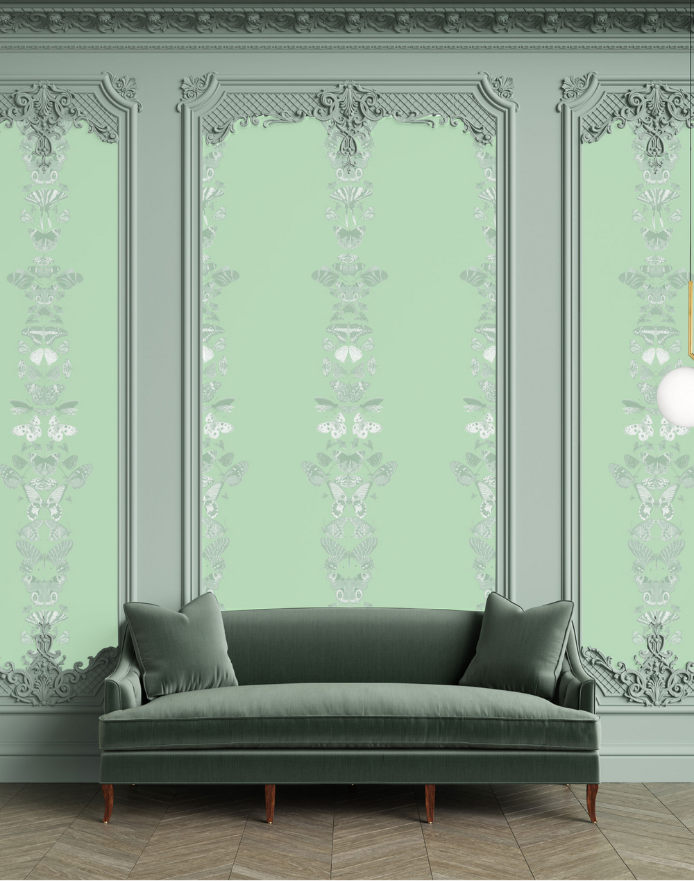 Metamorphosis celebrates the cornucopia of butterflies that emerge from this extraordinary trans figurative process. Forty species of hand-drawn, exquisitely painted butterflies are carefully placed structuring a kaleidoscopic column, at once delicate and architectural. The thread of symmetry carries all the reassurance of pattern, yet the ever-changing species and their array of brilliant colors reinforce the ideas of hope and renewal that underpin this design. The generous spacing between columns presents each as a monument, imbuing a space with structural elegance whilst paying tribute to the complexity of the natural world.