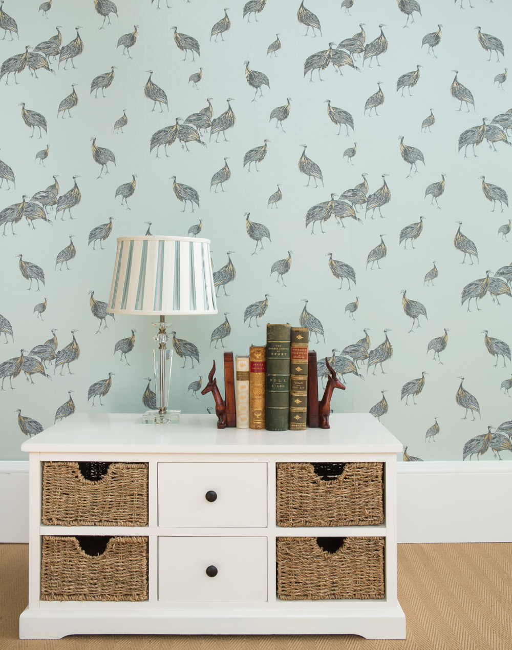 Birds of a Feather is playful yet sophisticated. The use of metallic pigments in the feathers creates a gorgeous effect when light hits the surface at different angles. This design can work beautifully in a whole room, or as a feature wall.