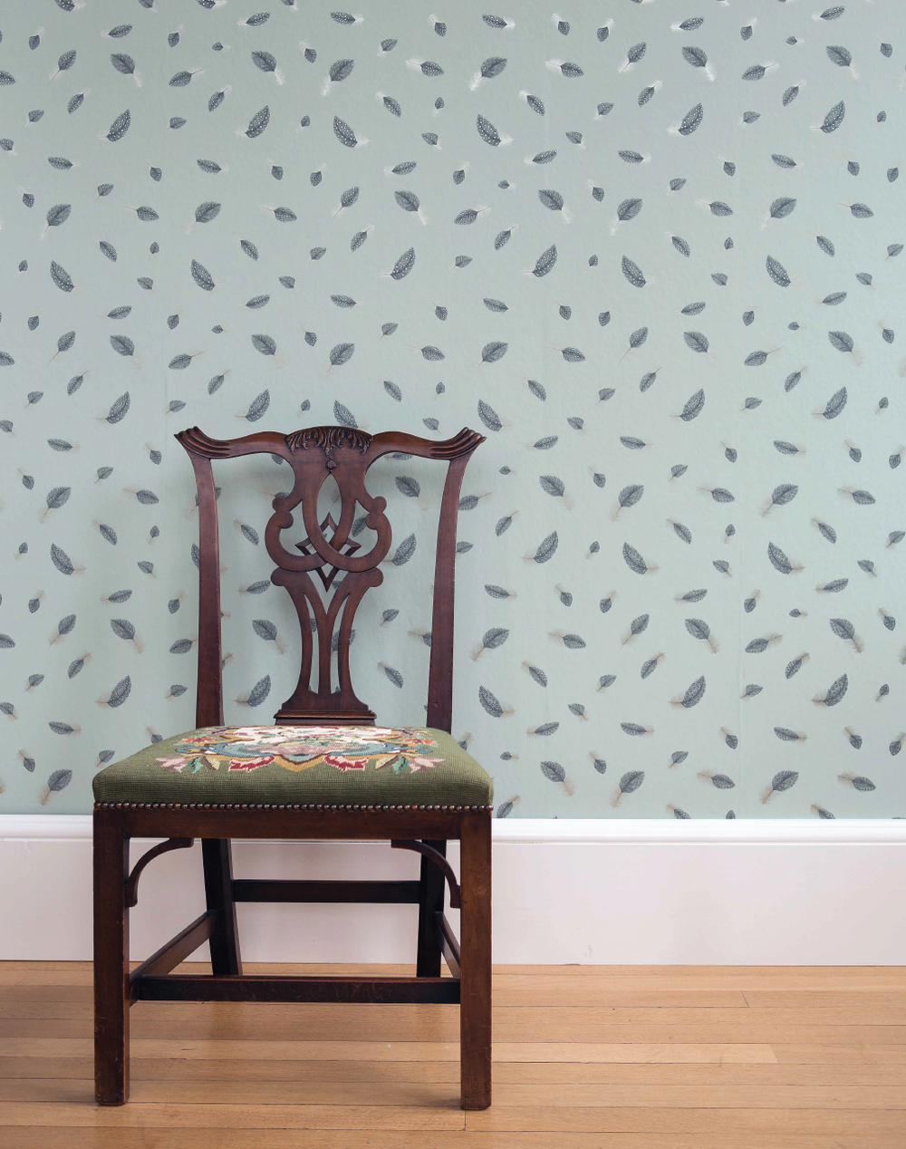 This design consists of different sized Guinea Fowl feathers, cascading down the paper. The elegant and gentle design structure is calm and harmonious and summarizes this whole collection in terms of detail, tone and meaning.