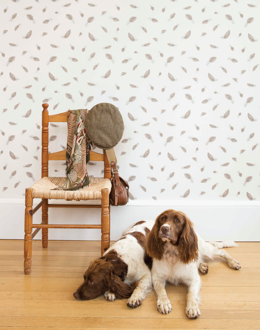 This design consists of different sized Guinea Fowl feathers, cascading down the paper. The elegant and gentle design structure is calm and harmonious and summarizes this whole collection in terms of detail, tone and meaning.
