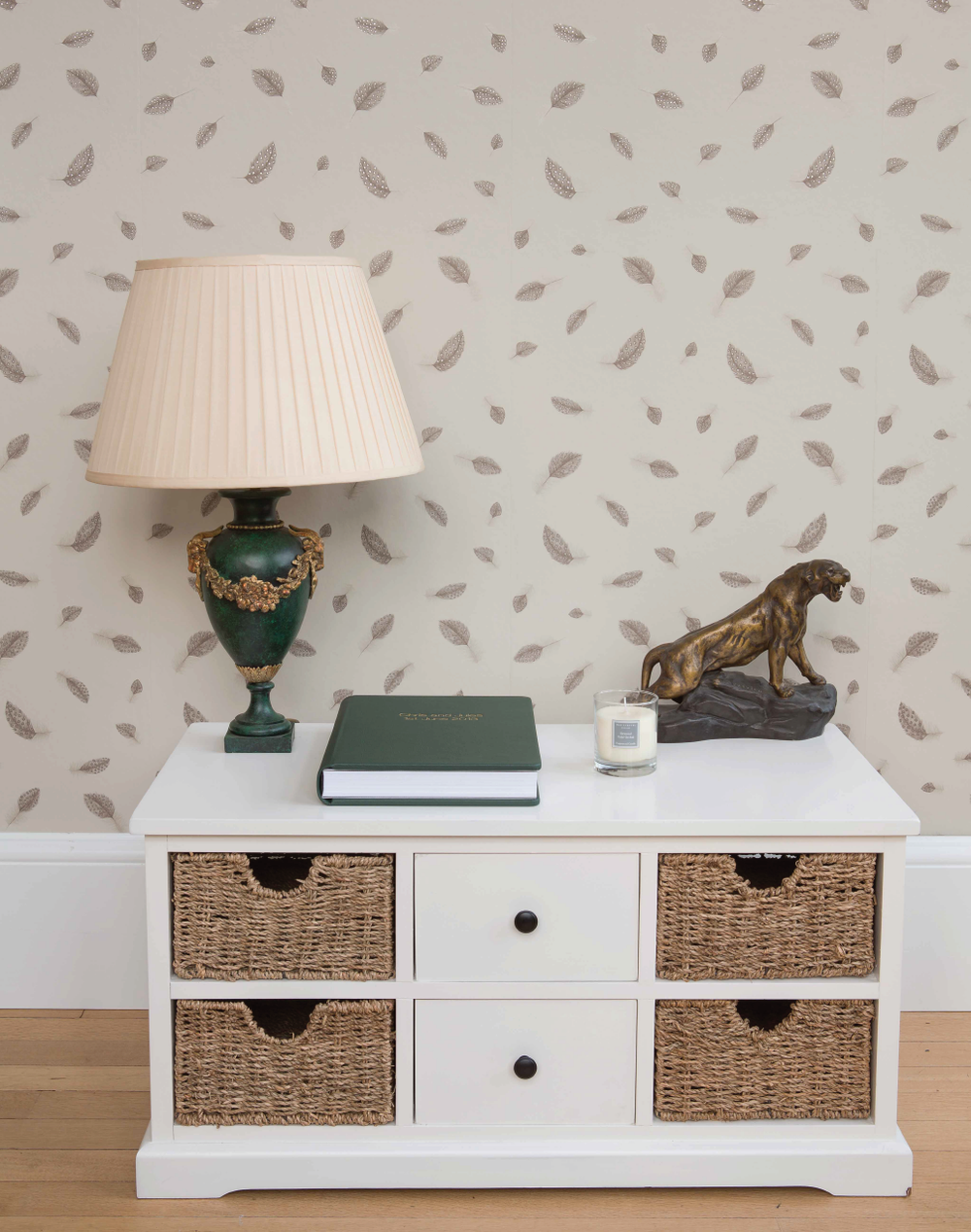 This design consists of different sized Guinea Fowl feathers, cascading down the paper. The elegant and gentle design structure is calm and harmonious and summarizes this whole collection in terms of detail, tone and meaning.