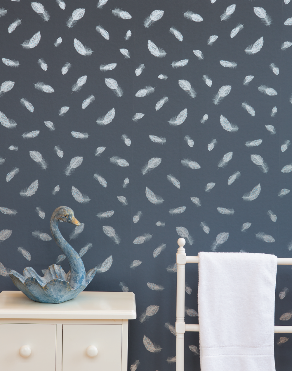 This design consists of different sized Guinea Fowl feathers, cascading down the paper. The elegant and gentle design structure is calm and harmonious and summarizes this whole collection in terms of detail, tone and meaning.
