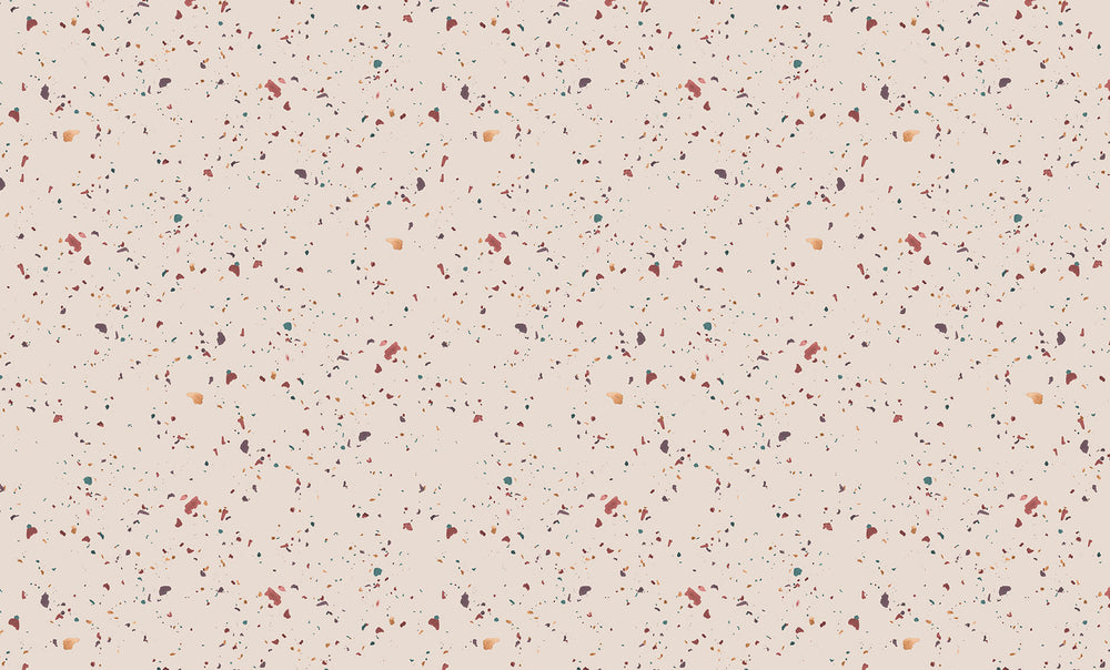 Shades of dark mauve, ochre, deep plum, and teal green on a pale fleshy peach background