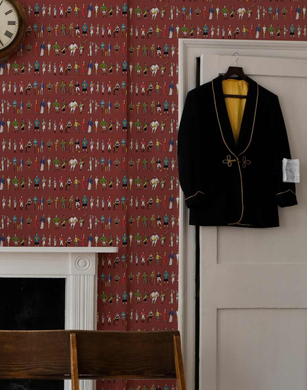 Multi colored illustration on a brick red background