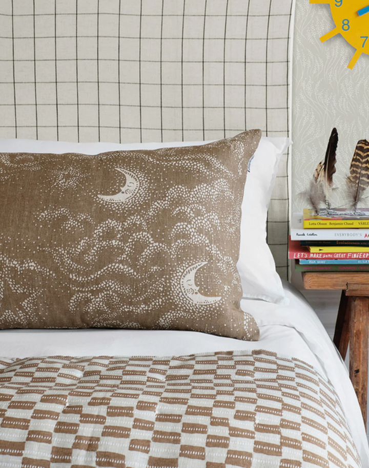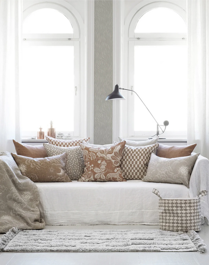 Gustav is drawn by hand and is printed by our Master printers on our beautiful and sustainable high quality linen weave, which is lively and make our patterns age with grace.