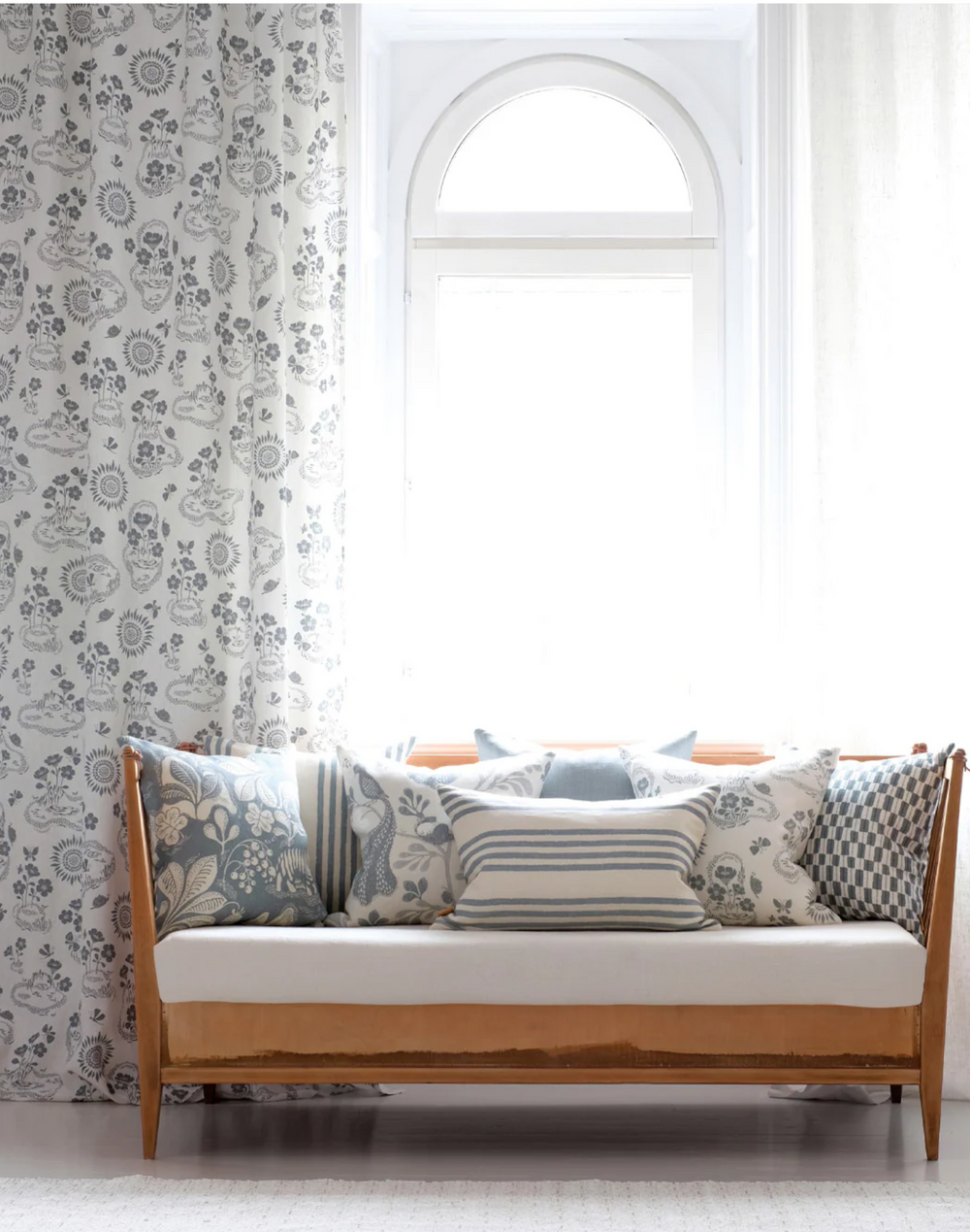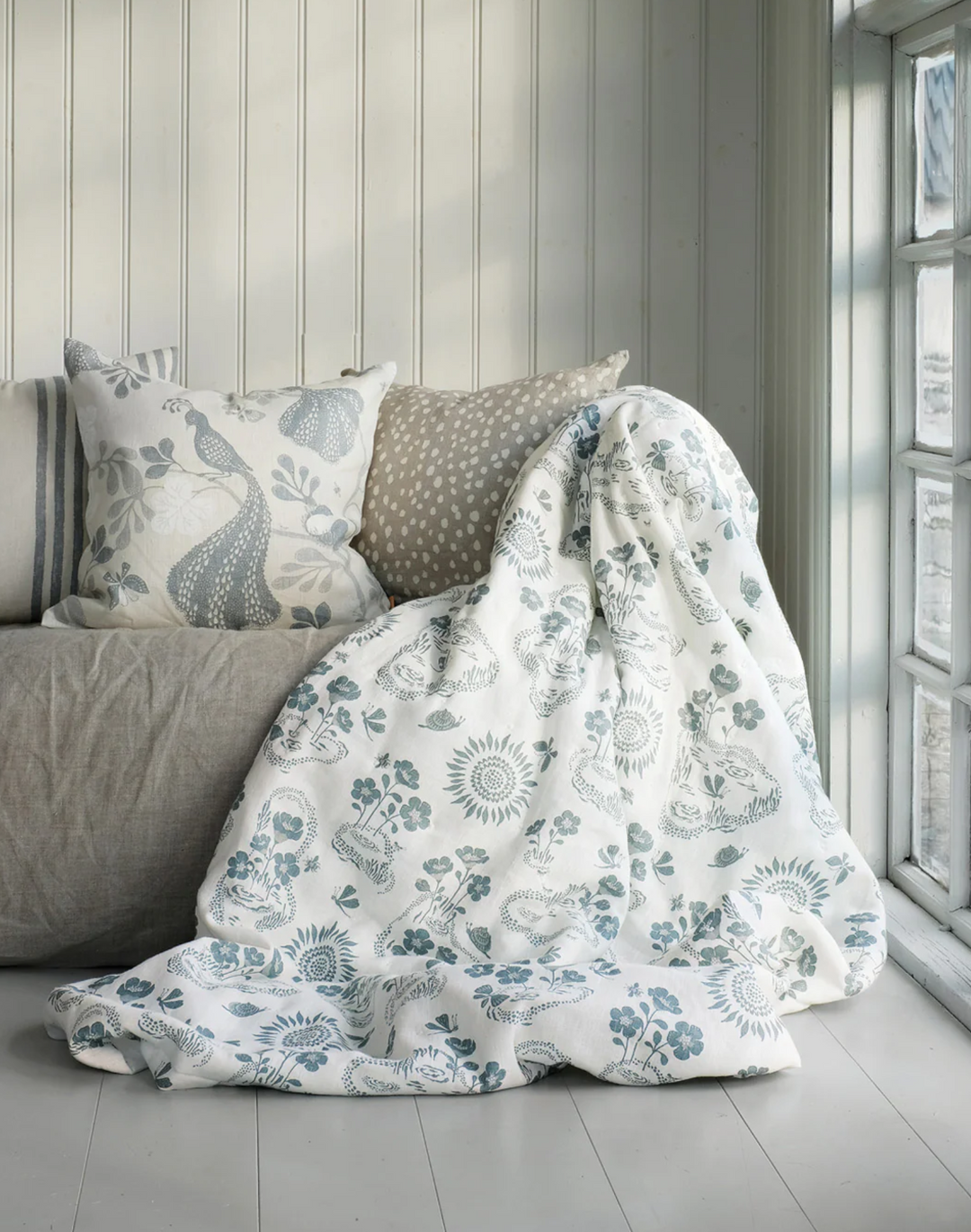 Midsummer is drawn by hand and is printed by our Master printers on our beautiful and sustainable high quality linen weave, which is lively and make our patterns age with grace.