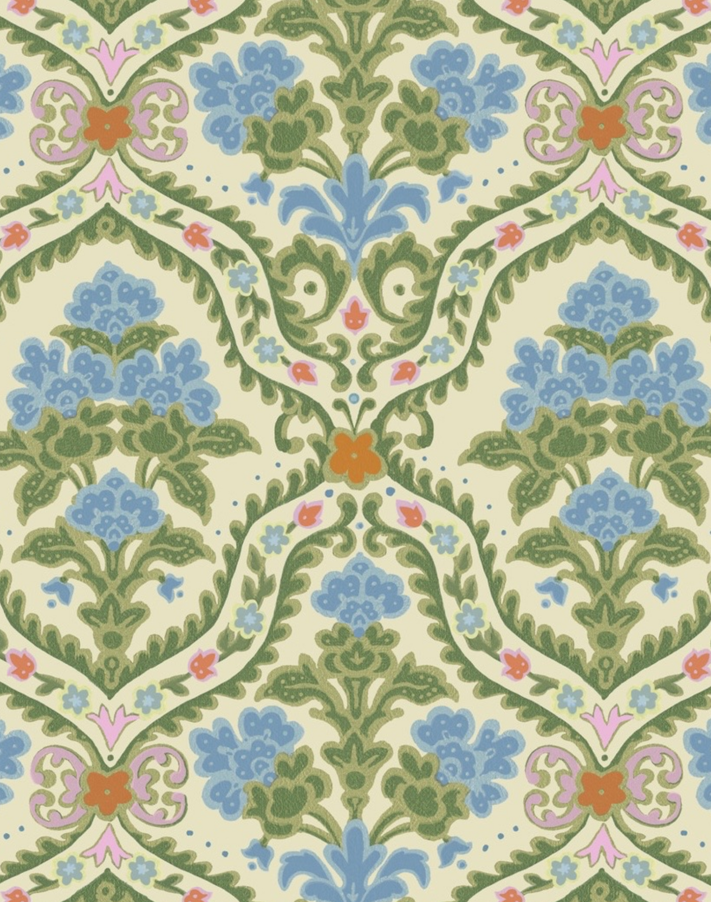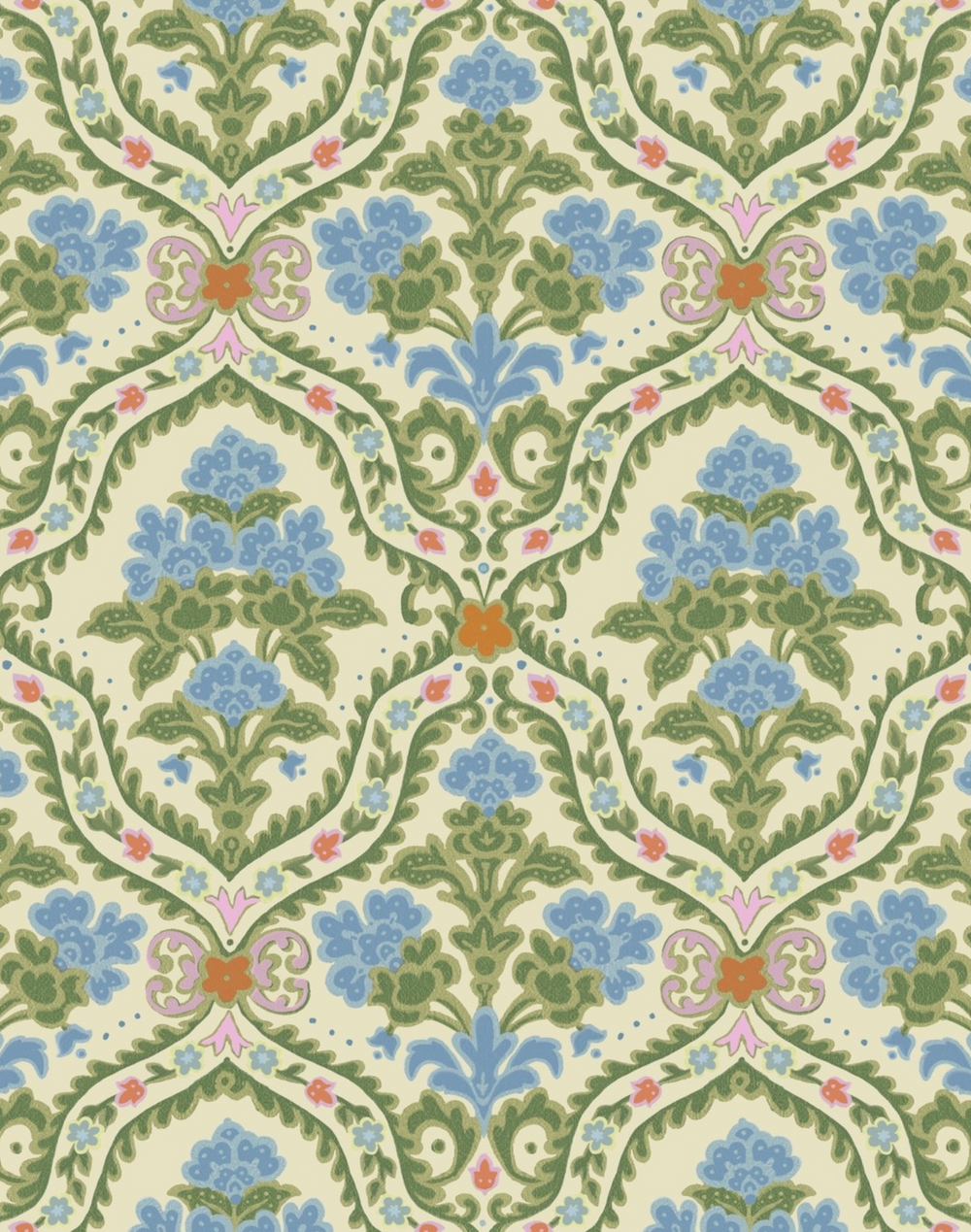 Inspired by her Nana Joyce, this print is a strong and stunning chintz tile design with bold colors. Joyce print has been reimagined and recolored with collaborating files sourced at Print Pattern Archive.