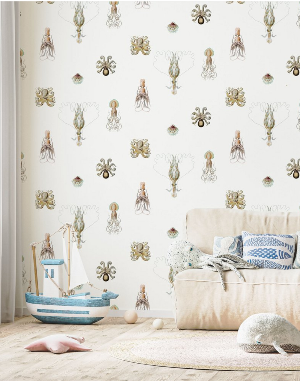 With graphic precision and delicate shading, each octopus in this design looks as if it swam straight from out of a science fiction novel. Inspired by the intricate works of Ernst Haeckel, Consortium brings forth a symphony of detailing and symmetry, making it a versatile addition to any space.