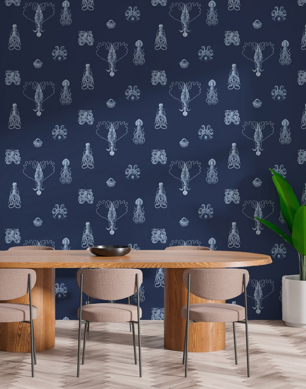 With graphic precision and delicate shading, each octopus in this design looks as if it swam straight from out of a science fiction novel. Inspired by the intricate works of Ernst Haeckel, Consortium brings forth a symphony of detailing and symmetry, making it a versatile addition to any space.