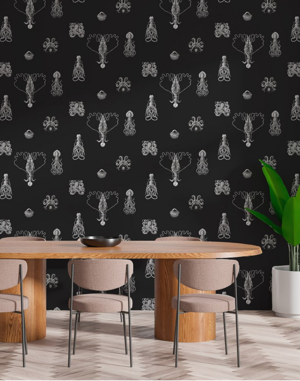 With graphic precision and delicate shading, each octopus in this design looks as if it swam straight from out of a science fiction novel. Inspired by the intricate works of Ernst Haeckel, Consortium brings forth a symphony of detailing and symmetry, making it a versatile addition to any space.