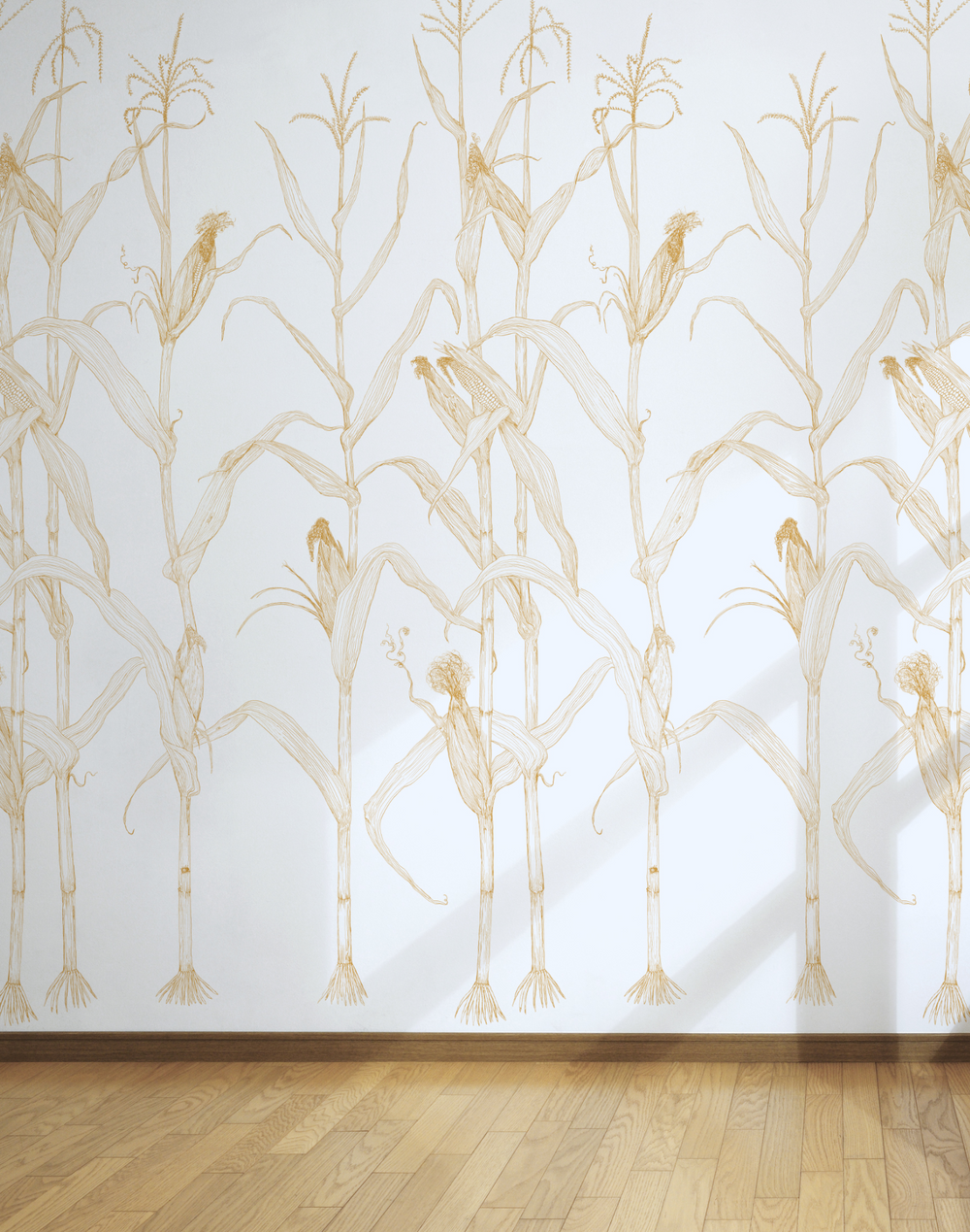 Inspired by growing up in the farmlands of the Eastern Shore of Maryland and the cyclical life of corn, Merenda designed Corn Rows. These large and beautiful corn stalks are intended to bring peace and spaciousness to your wall.