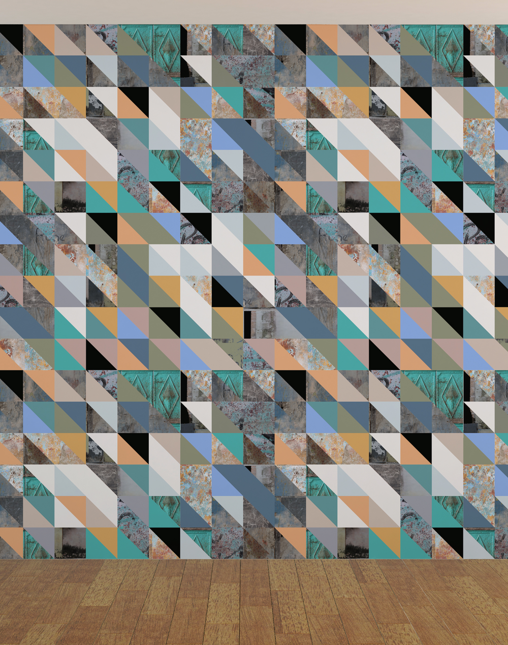 Disintegration—named after an album by The Cure—is a collage of photographs taken during days of walking through the streets of Havana, arranged in and filled with textures that are dissolving and reemerging in triangular forms. Merenda loved the way people used what they had to create patterns in Havana’s architecture. By using pieces of broken tile and plaster—and recycling what was around them—people created compositions of playful colors that work off of one another, creating vibrant mosaics.