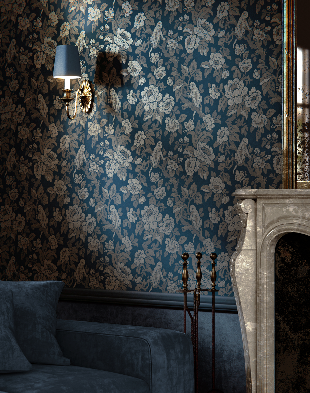 An exquisite combination of metallic gold with a deep blue background and printed traditionally on a luxuriously fibrous paper, this works particularly well as a sumptuous bedroom wallpaper.