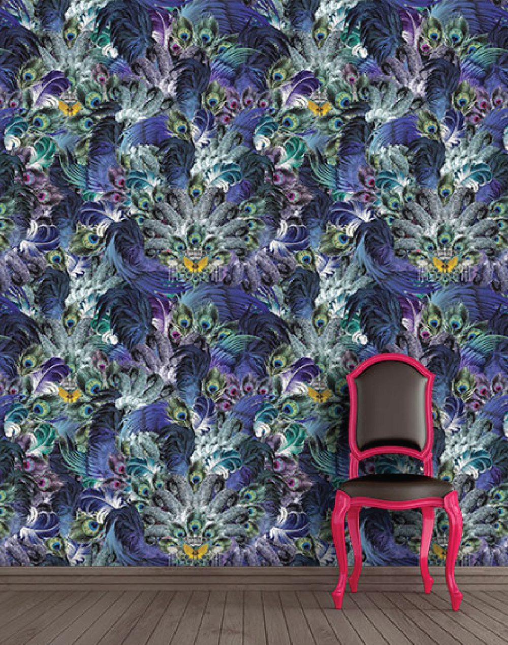 This beautiful pattern sees a magnificent array of peacock feathers, ostrich plumes and dove wings, which display a warm hint of metallic gold as the light catches.