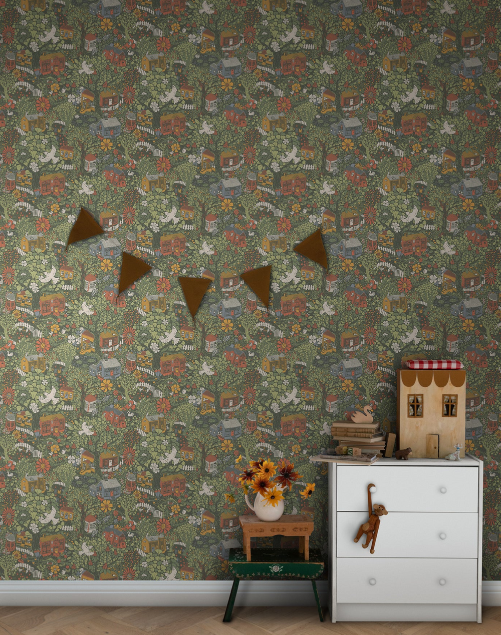 Venture through a storybook village filled to the brim with charming houses, ancient trees, lush gardens, and farm animals. The village in "Bygga Bo" is a palette of rich greens, pale blue, golden yellow, red, and ivory.