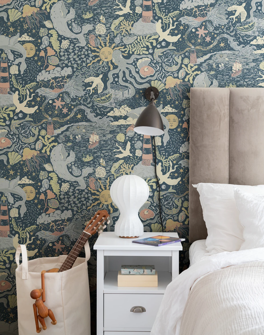 This whimsical print is a lovely illustration of the sea's boundless expanse and all of its inhabitants. Illustrations of whales, jellyfish, octopuses, fish, oysters, seashells, starfish, seabirds, and much more are scattered among a variety of sailing adventures! This image features a navy background with blue, lime, coral, golden yellow, and cream hues.
