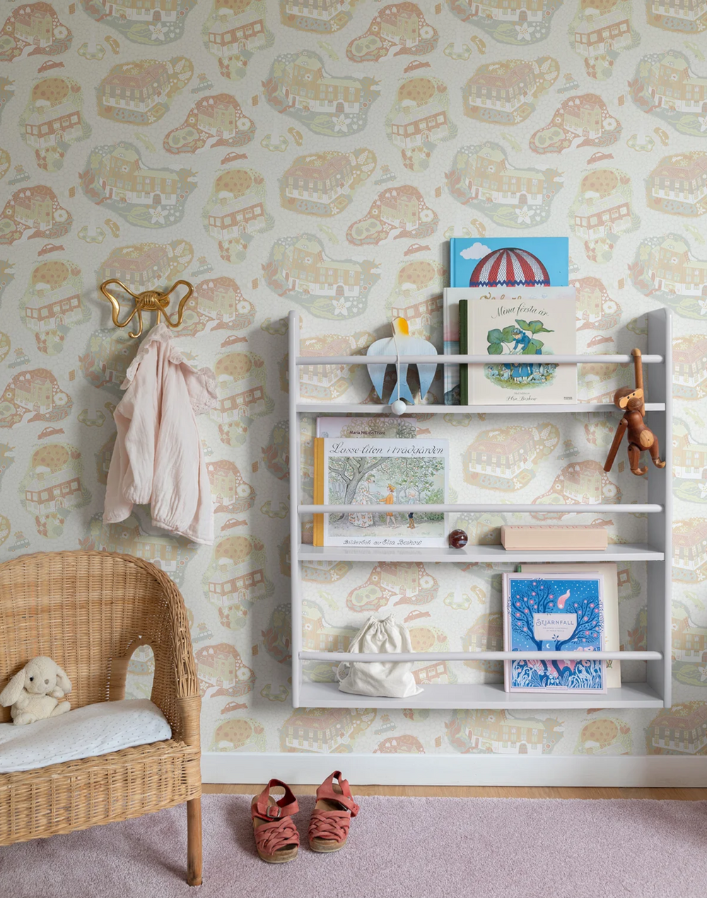 Enjoy driving around the most picturesque village on cobblestone roads! A range of vehicles traverse charming neighborhoods in the graphic design, with each house showcasing a distinctive garden and surprising details. This lovely pattern is composed of pale red, golden yellow, lime, pale blue, white, and light greys.