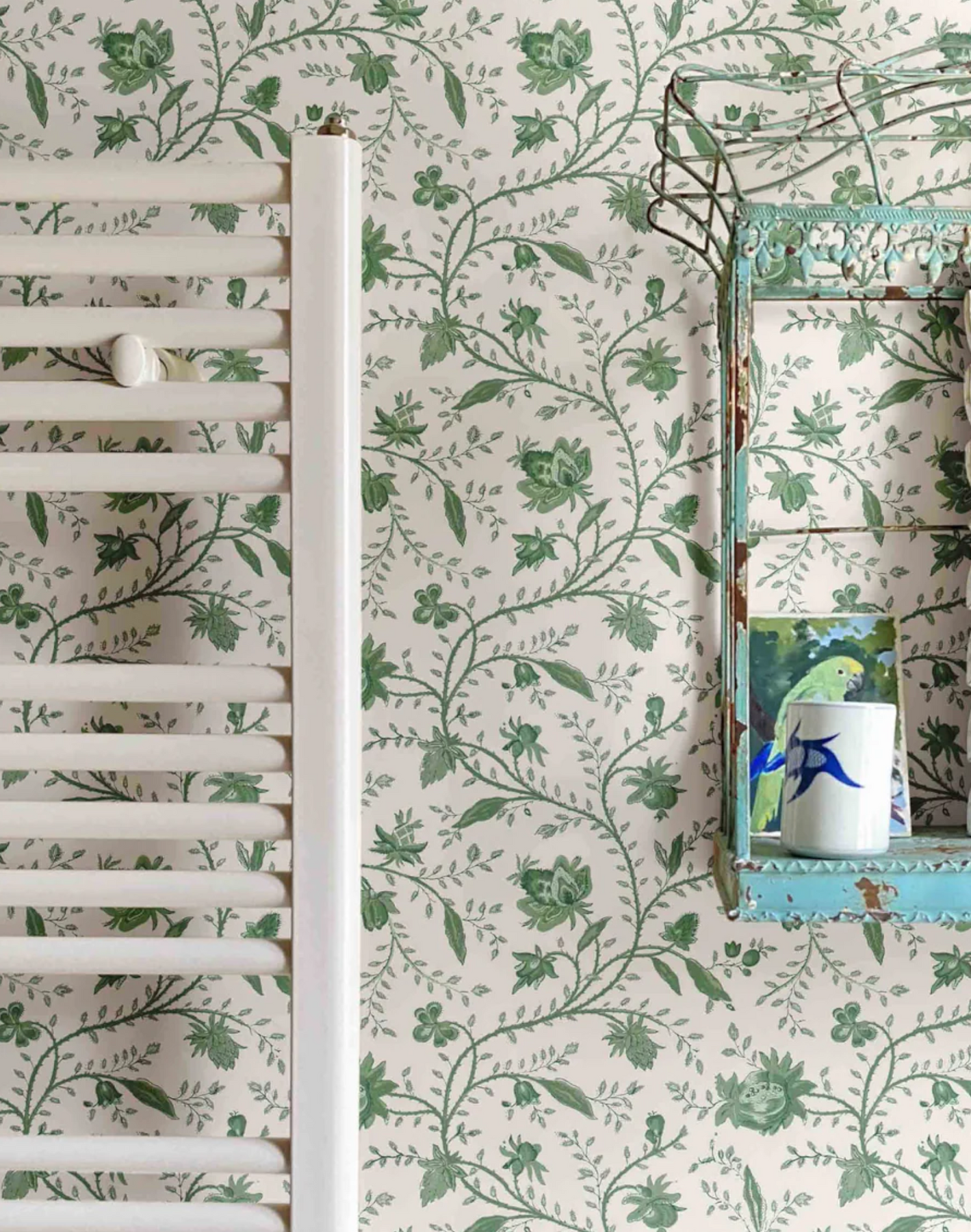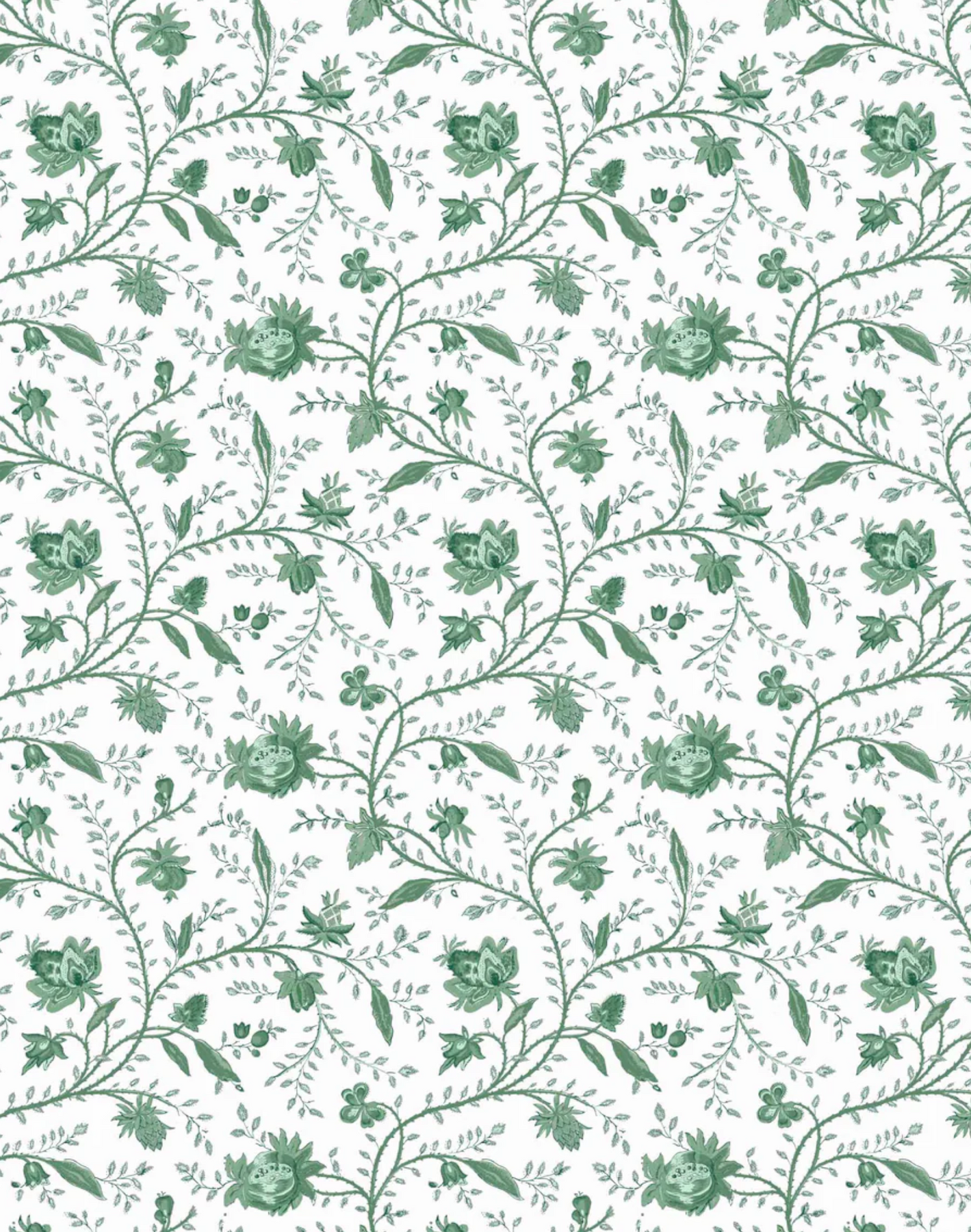Inspired by a vintage Indienne design and meticulously printed in the UK, our green Indienne floral wallpaper is a reinterpretation of this heritage pattern that adds a sophisticated new look. Perfect for bedrooms, baths, kitchens, or any area that needs some classic and elegant design, delicate trailing blossoms in sharp Tourmaline green and white create a sensation of movement and light.
