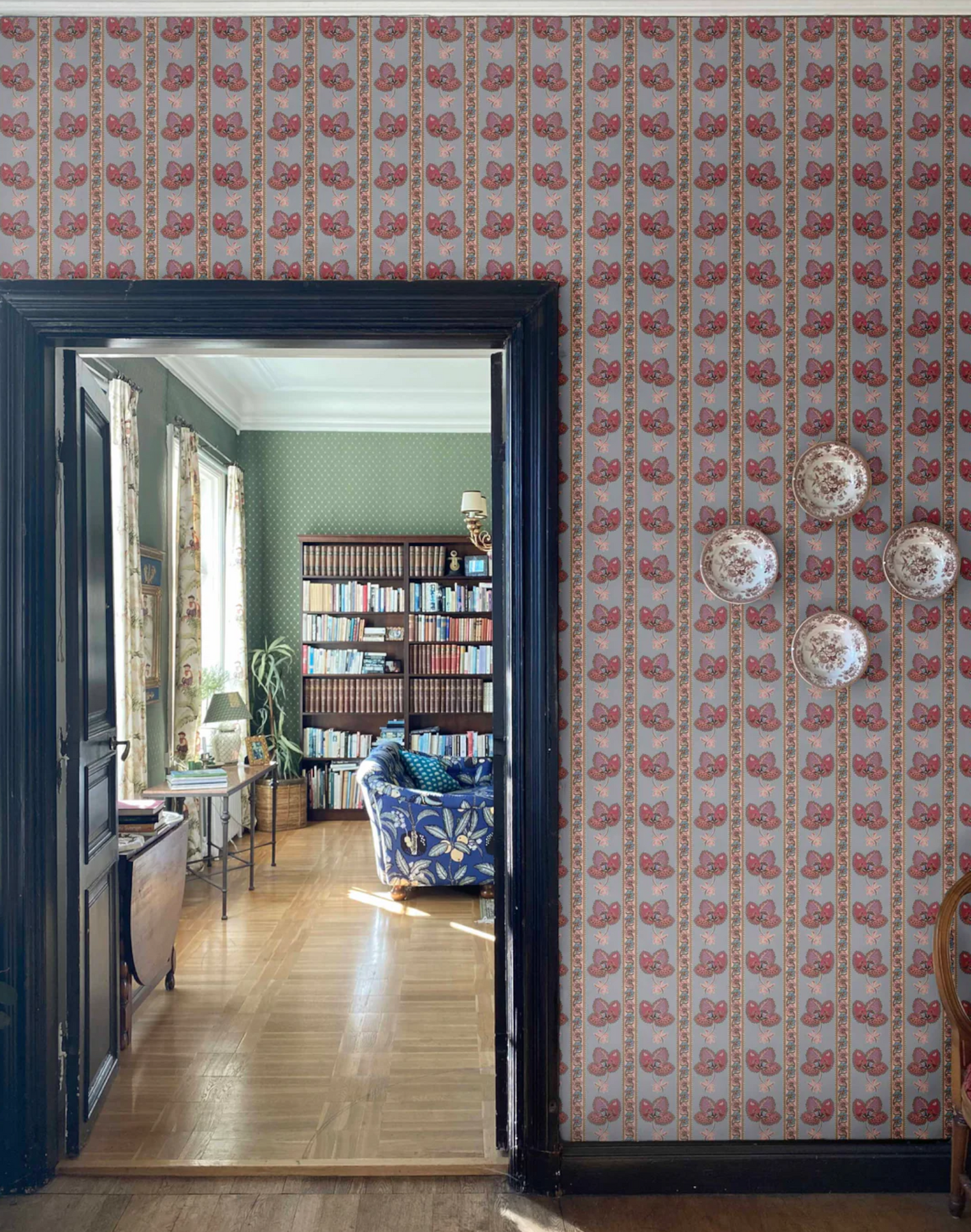 You’ll find both elegant, bold statement colors and delicate details throughout her designs, which have mainly been inspired by vintage prints found rummaging in antique shops around the world.  Wallpaper are designed and printed in the UK and Sweden and all the raw materials to are sustainably sourced and made in Europe.
