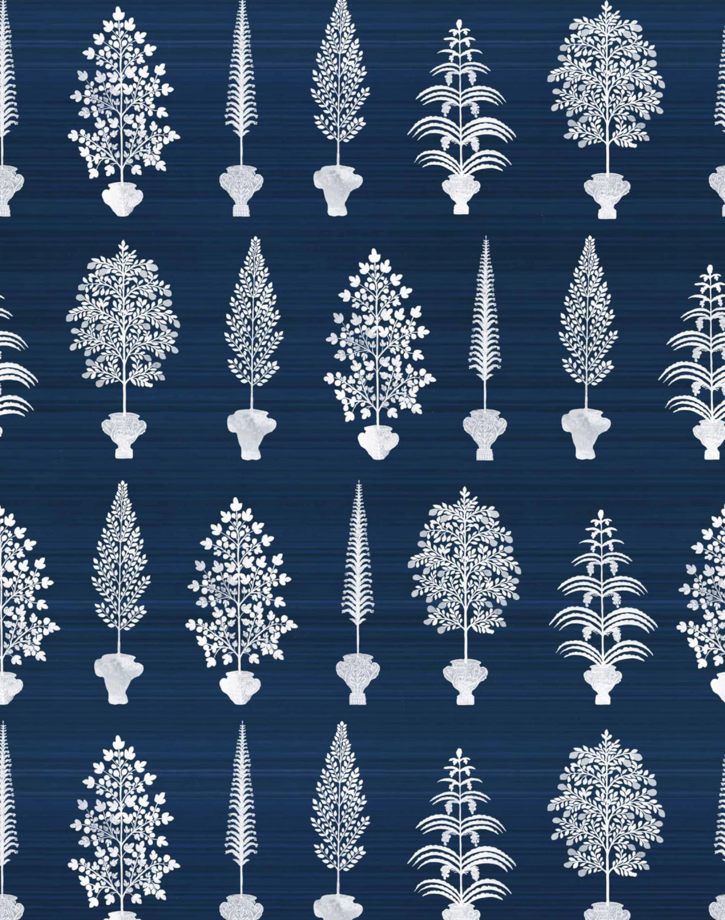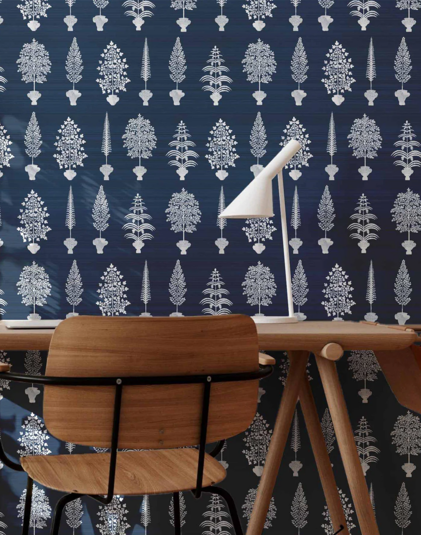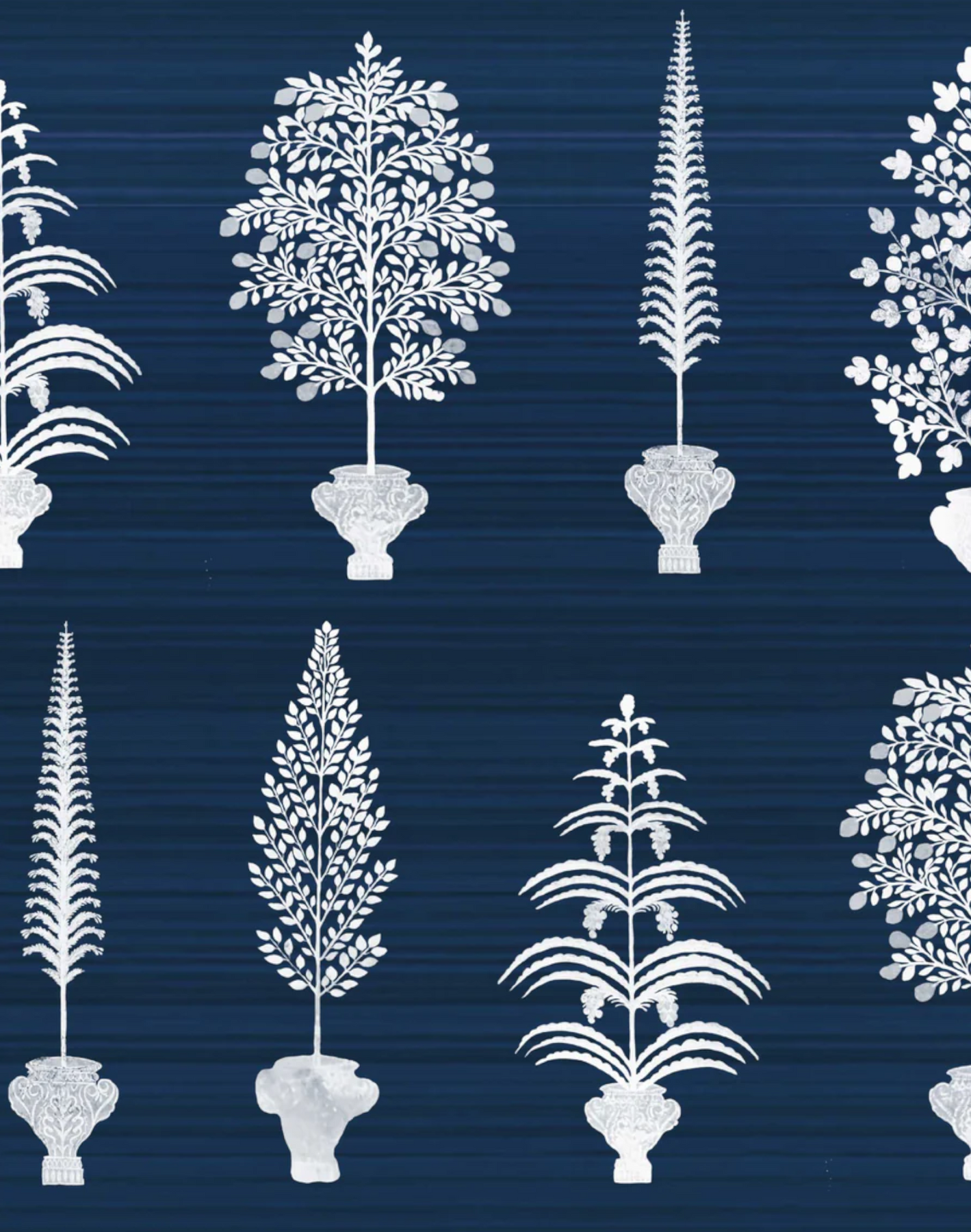 Inspired by hand painted artwork found in a spiritual home in Eastern Europe, this intricate, yet soothing botanical design features white silhouetted trees on a navy blue background.