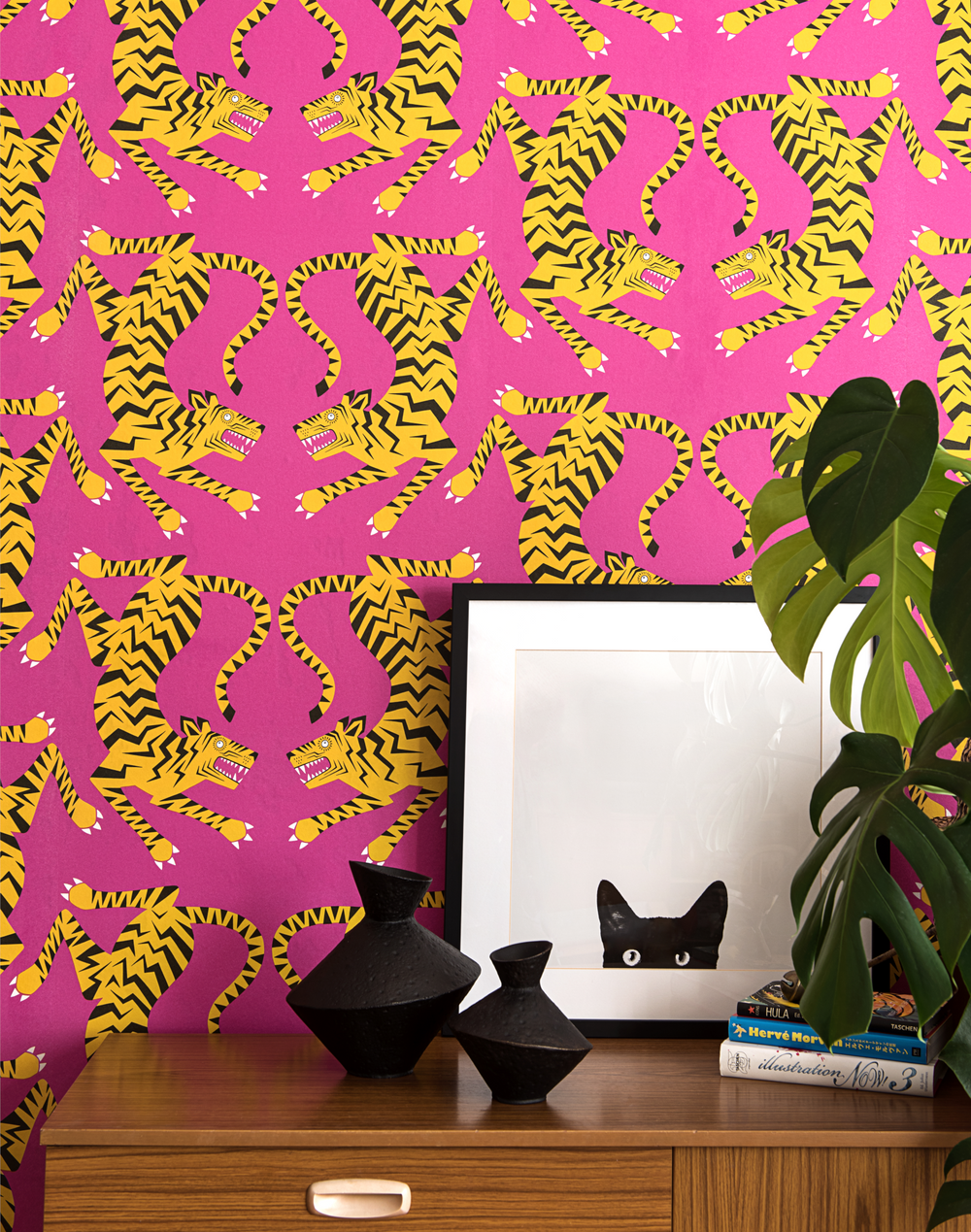 Graphic, stylized tigers dance together in this fun, vibrant wallpaper. A bold mirrored pattern, it is ideal for those wanting to make a statement and is available in five striking colorways with names as memorable as their designs ? Tony, Trixie, Tabby, Tinker and Tigger.