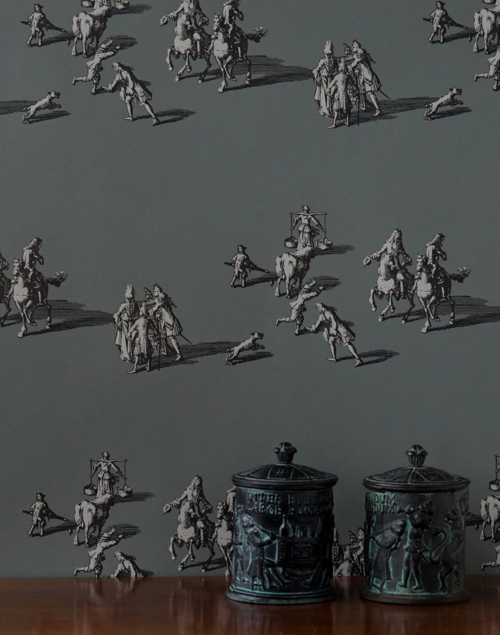 This pattern has borrowed parts from a Gothenburg motif from the 17th century Suecia antiqua et hodies. By clearing away the urban environment from the original image, it looks as if the figures are strolling in a park.