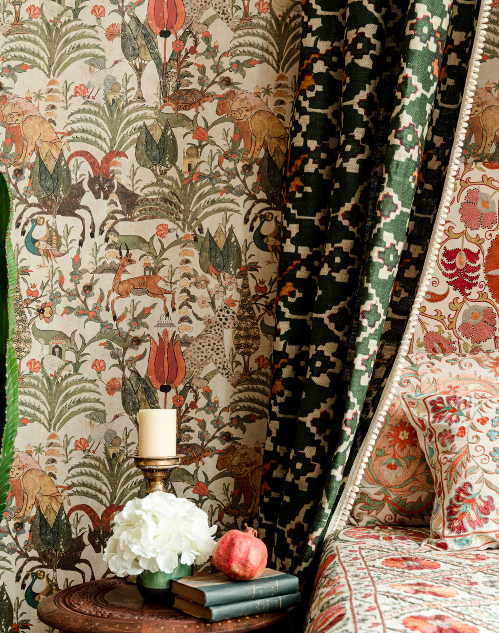 Step into the magical, mountainous landscape of ALGERIAN TALE where native wildlife roams freely amongst desert shrub land and small, ornate architectural landmarks. Tortoises move slowly to the heartbeat of the natural environment and large cats prowl majestically as this enchanting print draws you in, calling you to be at one with the landscape and the lively ecosystems which lie within it. The earthy palette is brought to life with rich, terracotta florals adding a calming ambience to the home.
