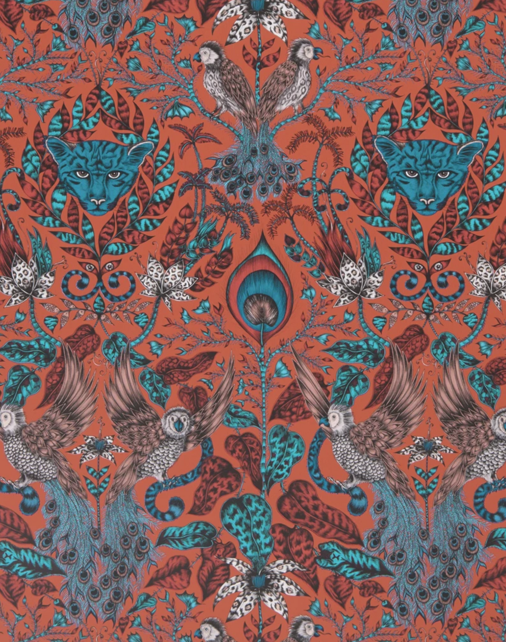 The Amazon Wallpaper is part of our magical Animalia collaboration with interior experts Clarke & Clarke. This design is inspired by the jungle scenes in the Amazon, featuring jaguars hidden amongst the foliage and playful parrots in the trees. Channel the exoticism of the jungle with the vibrant, warm red and striking teal of the Red color way; a truly unique color way to inject a stunning air of design to your home.