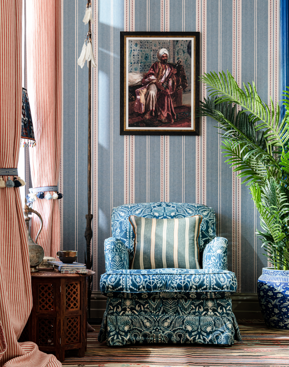 Referencing the uniformity of patterns found on original Berber rugs, the BERBER STRIPES print has a classic elegance which brings structure to a space. The monochromatic color way adds a beautiful juxtaposition when paired with the lively scenes found within other designs of the TALES OF MAGHREB collection.