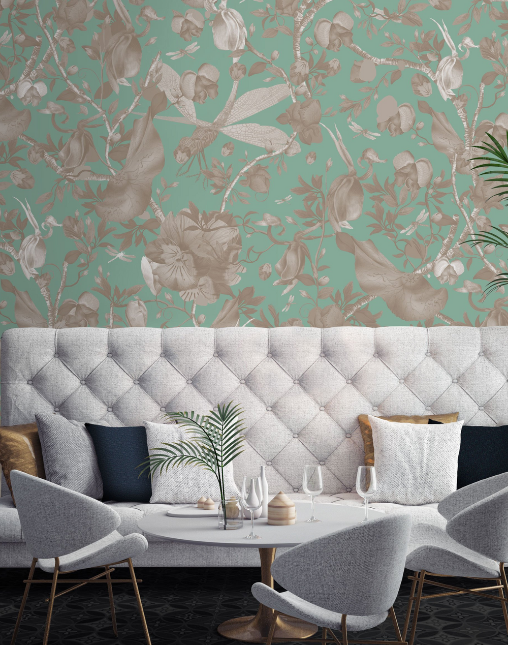 Biophillia exults in the surreal qualities of the natural world. Drawing on the tradition of botanical illustration, highly rendered flora and fauna celebrate the complexity and curiousness of nature. The striking use of color gives this design a distinct and modern visual identity, and is an expression of the studio’s passion for evoking the strangeness that is ever-present in the world around us. Printed in Preston, England, onto a coated non-woven base, the fine detailing of Biophillia combines the sumptuousness and tradition of the Baroque with modern design. This design, as one journalist put it, is “baroque for the 21st century”.