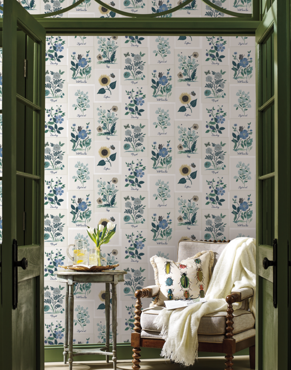 Designed to create a pinboard effect, our Botanical Prints wallpaper is an instant inspiration board, perfect for an accent wall or solarium. The illustrated florals were inspired by lithographs found in vintage floral guides. This wallpaper is gravure printed and comes in 27 inch rolls with a 24 inch repeat.