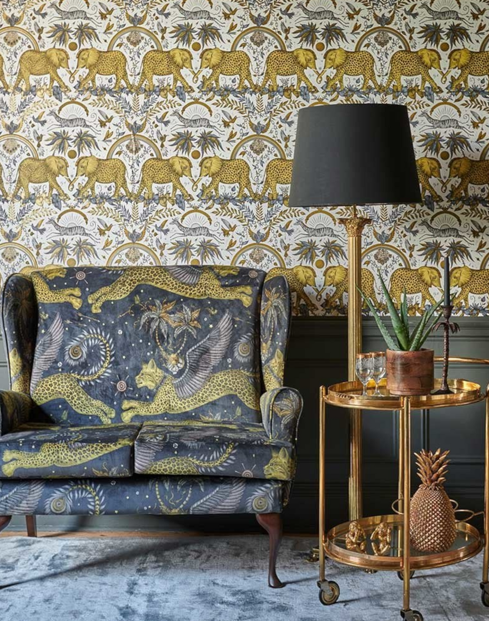The Zambezi Wallpaper will transport you to a fantasy jungle. Striking leopard-spotted elephants take center stage, inspired by Jules Verne`s adventure stories and Emma`s travels to Botswana. Leaping gazelles, birds of paradise and curious foliage also feature in this explosion of African magic. Creating a striking focal point in any interior with rich with golden metallic foliage, rainbows and leopard print that glints and shimmers when the light hits it, contrasted by charcoal greys and an off-white background. Lose yourself in the imaginative detail of this stunning wallpaper, guaranteed to transform your interior into a dream world.